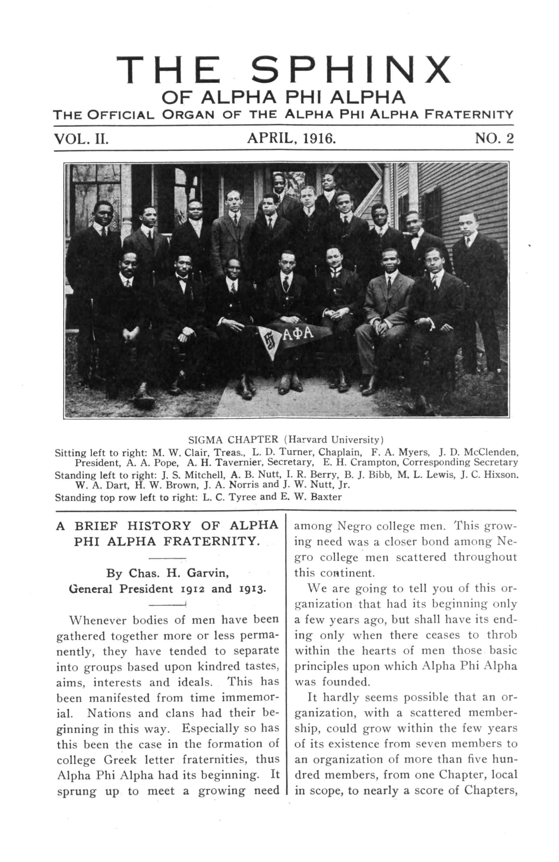 Whenever bodies of men have been gathered together more or less permanently, they have tended to separate into groups based upon kindred tastes, aims, interests and ideals This has been manifested from time immemorial Nations and clans had their beginning in this way. Especially so has this been the case in the formation of college Greek letter fraternities, thus Alpha Phi Alpha had its beginning. It sprung up to meet a growing need