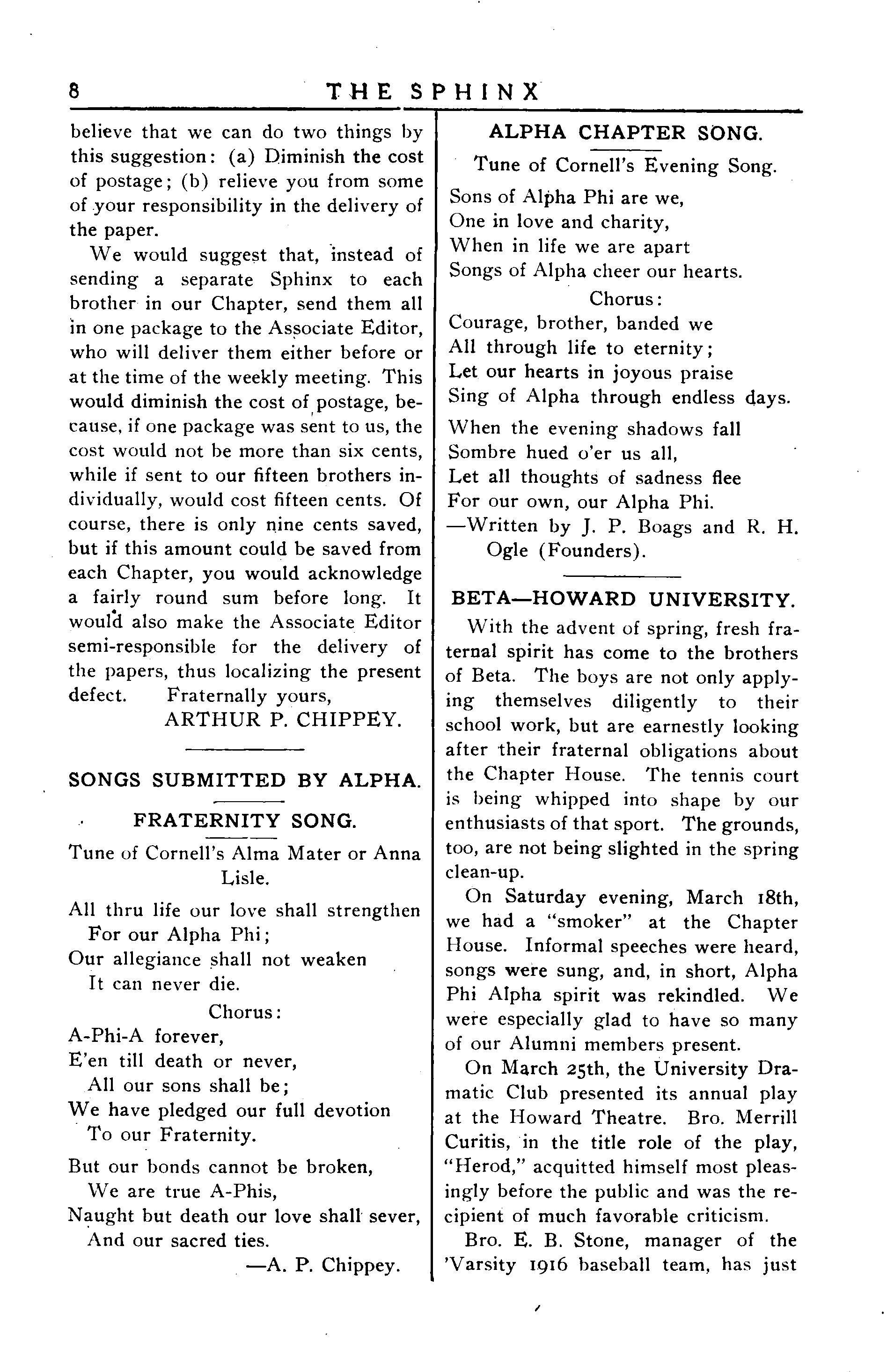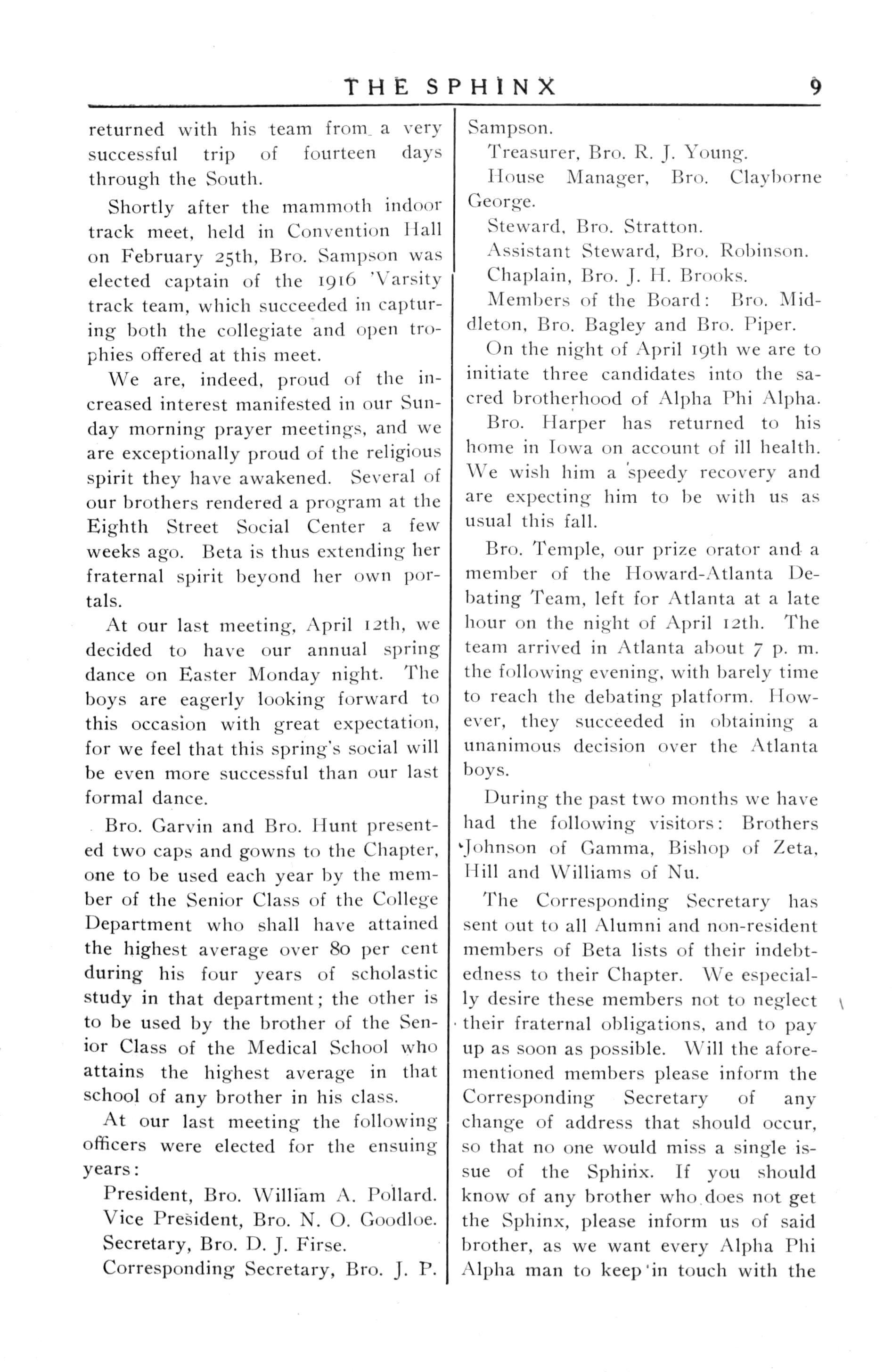 The Faculty gave three of the four appointments to the Class of 1916 to Alpha Phi Alpha men. Brother P. L. EdwoodswasawardedtheLatin Salutatory, while Bros.Wood and Burton werechosenascommencement orators.
