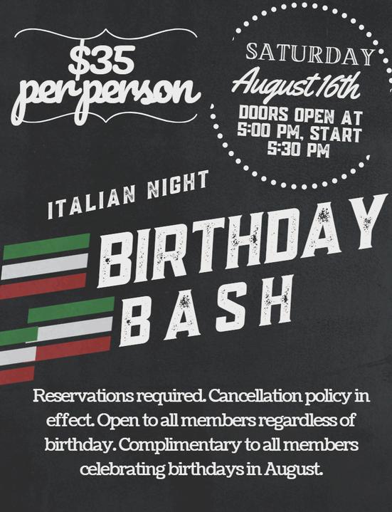 Italian Night is back at the August Birthday Bash on Saturday, August 16 Join us for a complimentary dinner if you ’ re an August baby Not your birthday? Join us anyway for the delicious Pasta Bar and more Be sure to make reservations as this event does sell out! th