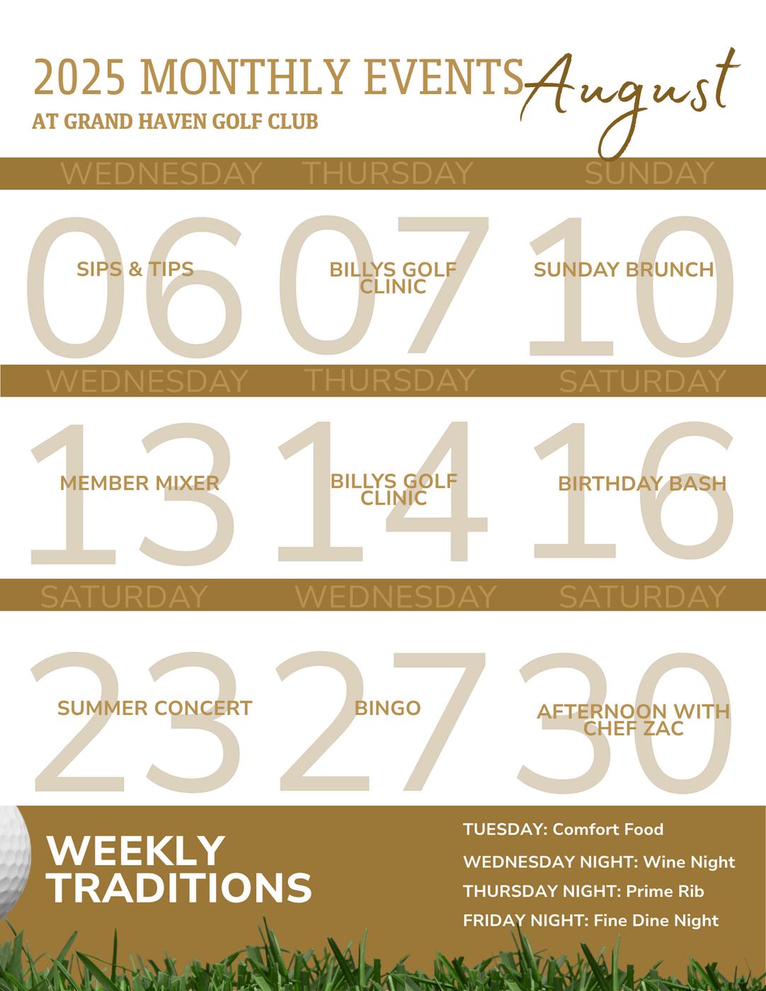 Are you looking for a relaxed way to enjoy the beautiful Grand Haven course, meet new people, and cap off your weekend with a delicious meal? Look no further! We're thrilled to highlight our "9 N Dine" Sunday event, designed specifically for those who love golf in a social, non-competitive setting