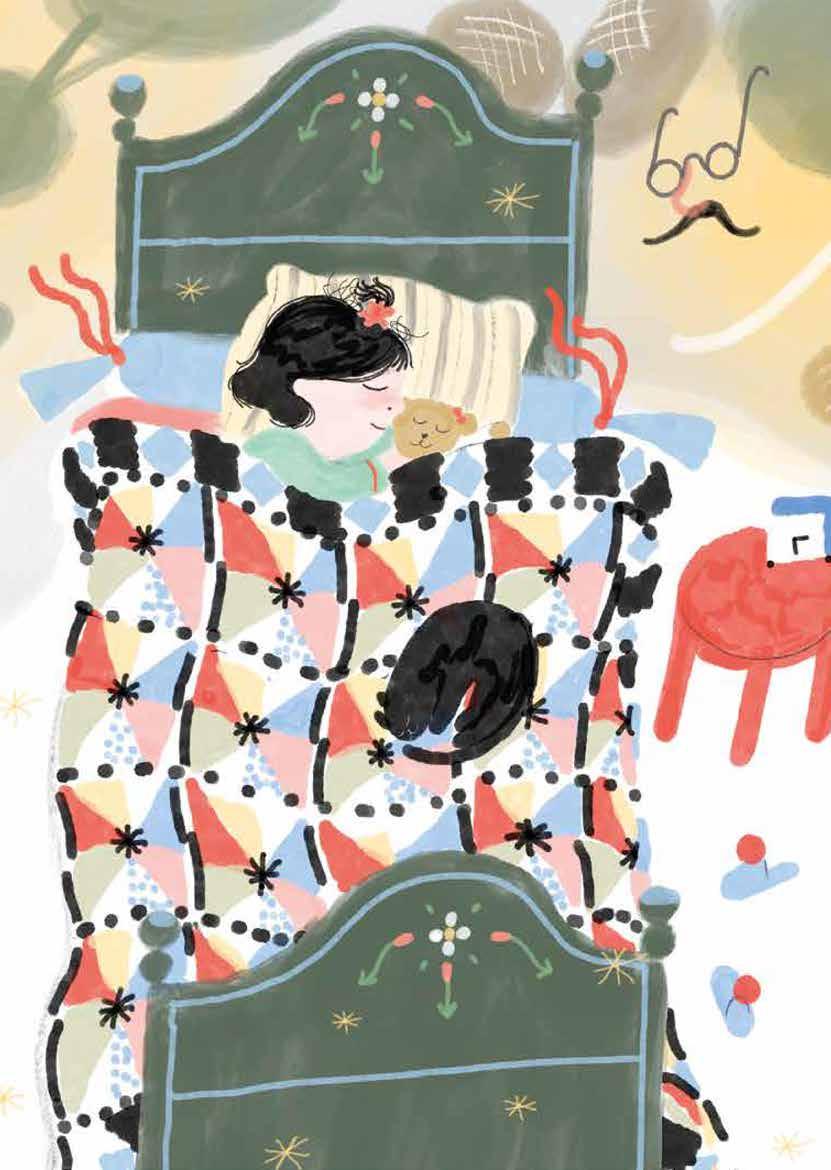 A fianco: illustrazione della diplomata Master Ana Terral, da "Clara ha perso il sonno", Pulce edizioni, 2025.