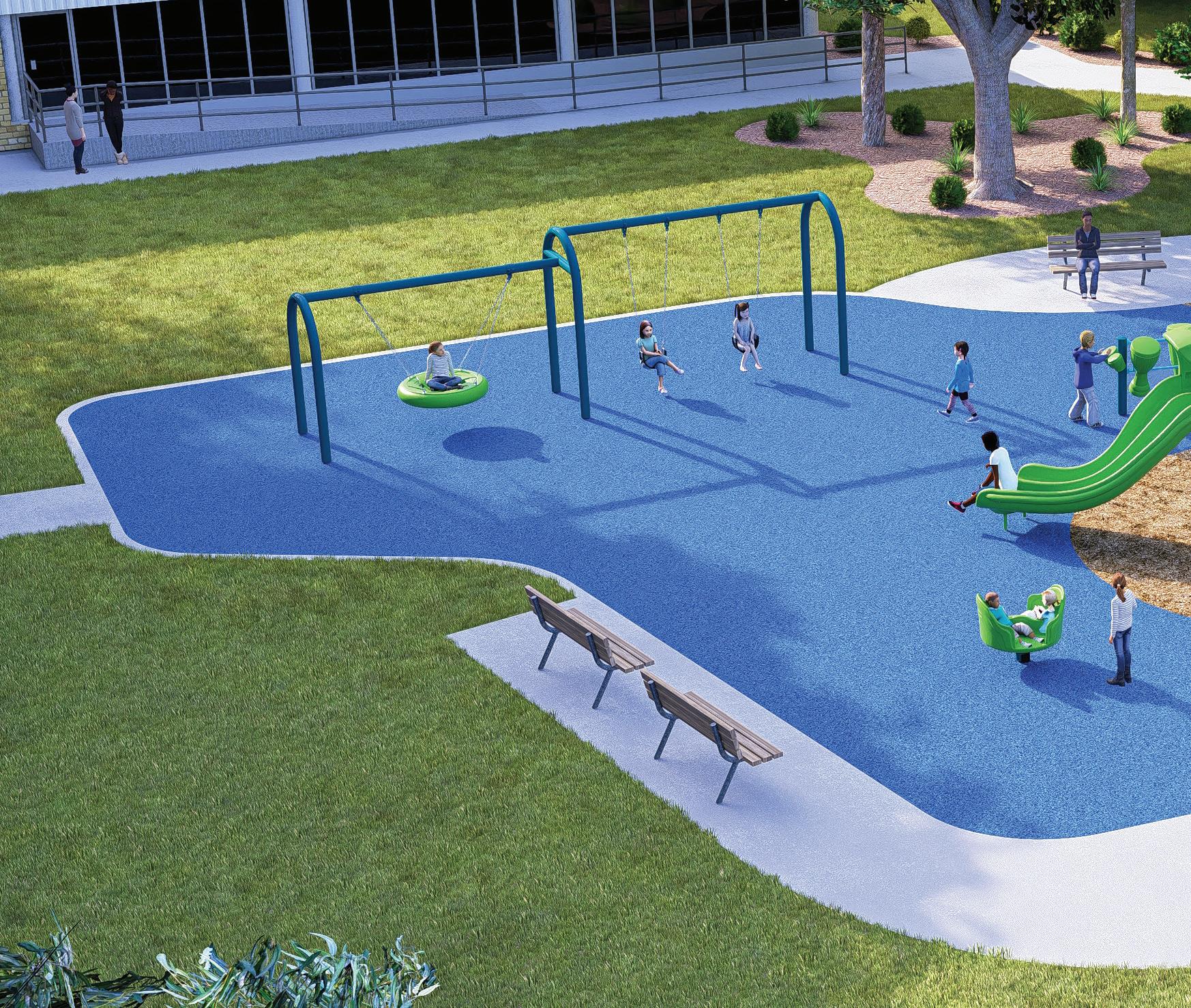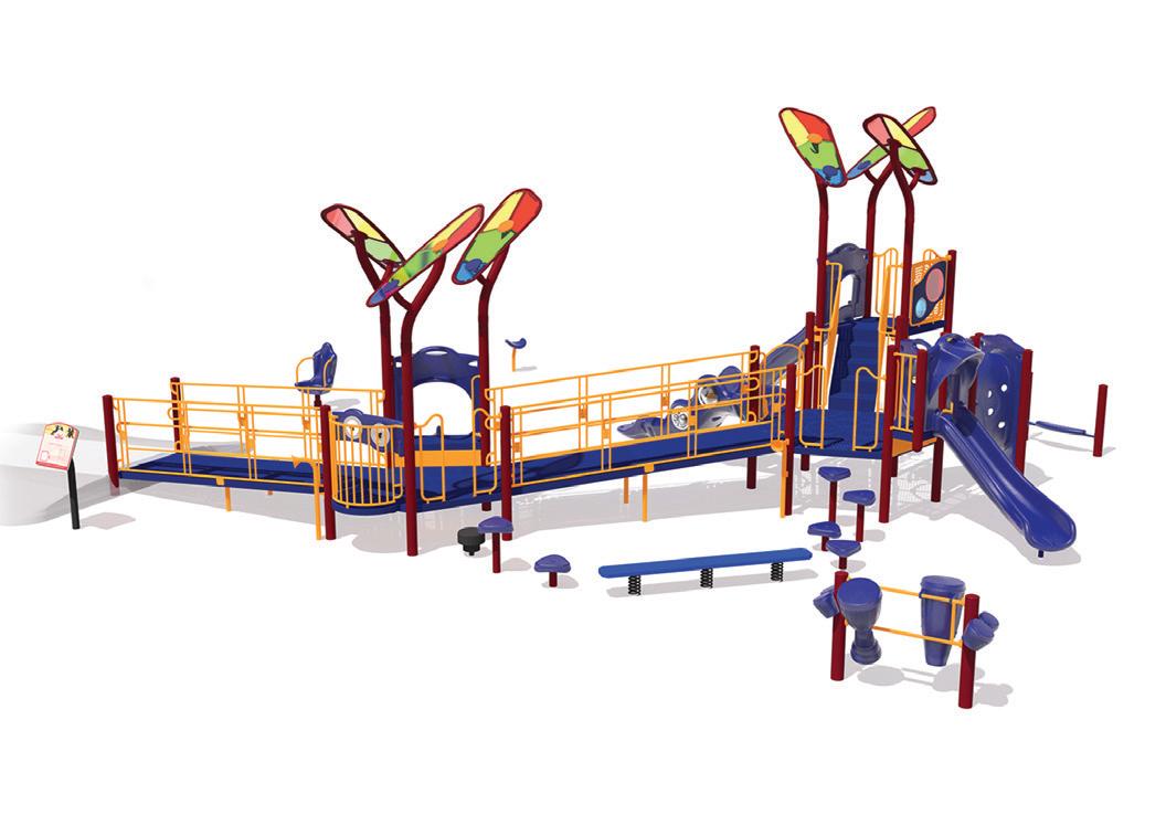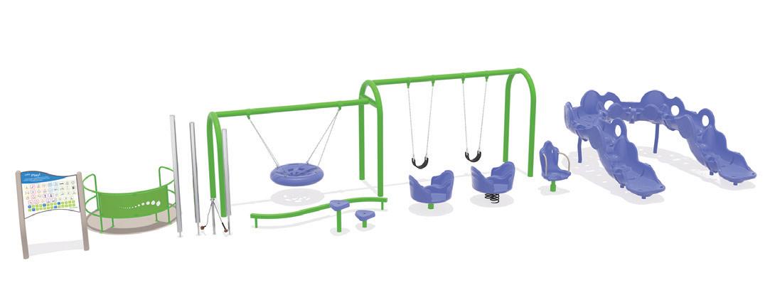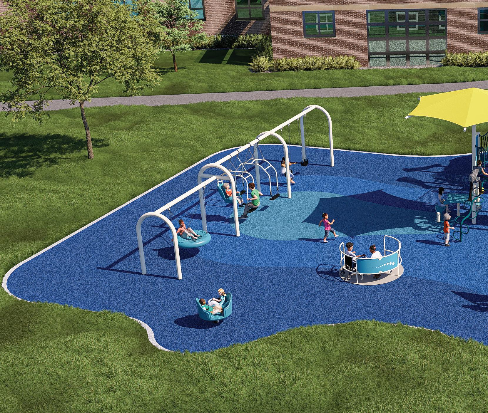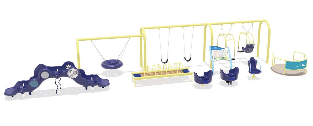 This playful space encourages children to explore a variety of sensory-rich features and freestanding motion and movement activities. These elements facilitate cooperative play and support motor planning and development to help children of all abilities comprehend and discover the world around them.