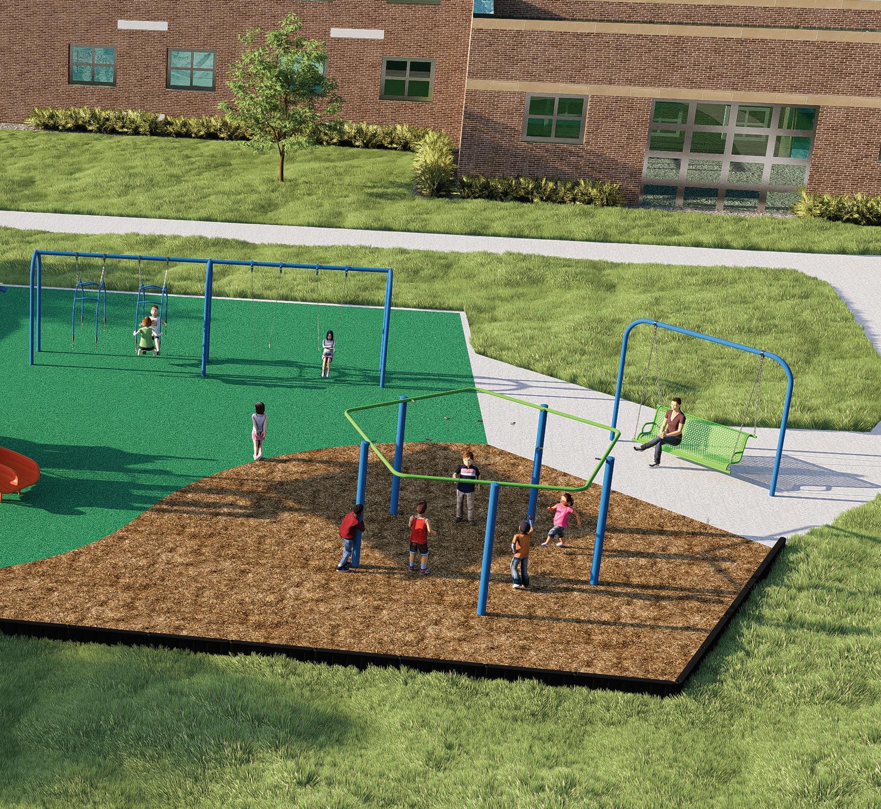 Freestanding equipment, such as musical instruments or the Bounce Bash court, adds variety to the play space and appeals to children with a wide range of interests. These collaborative play zones naturally encourage social interaction, helping students build meaningful friendships through play.