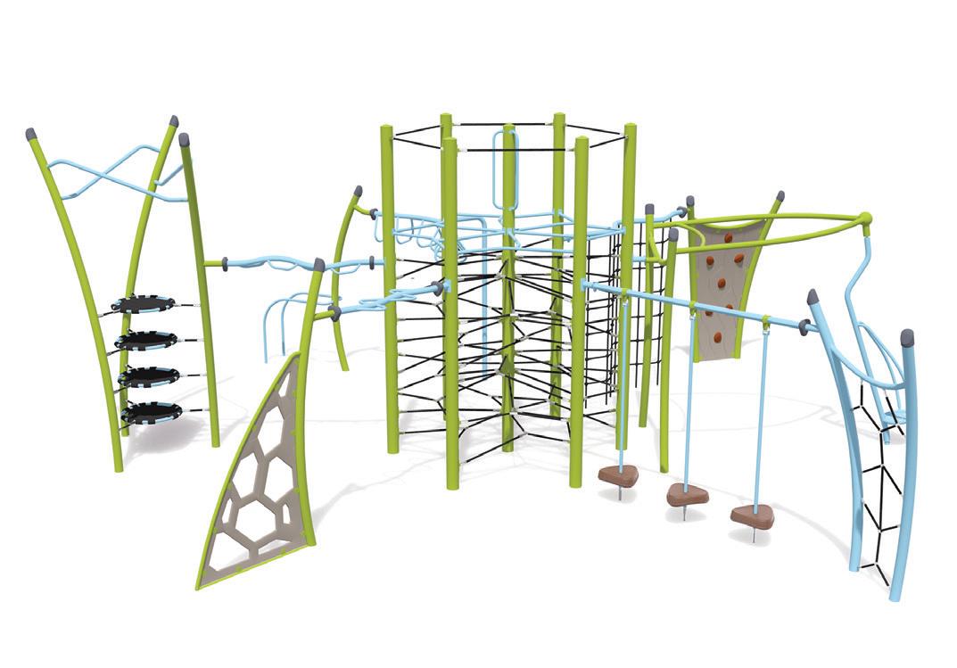 Children bond through friendly competition, and this playground design encourages it with a cyclical layout. A variety of climbers extend from the main system, branching out to either side, inviting children to use their imagination to create tracks and race against each other.