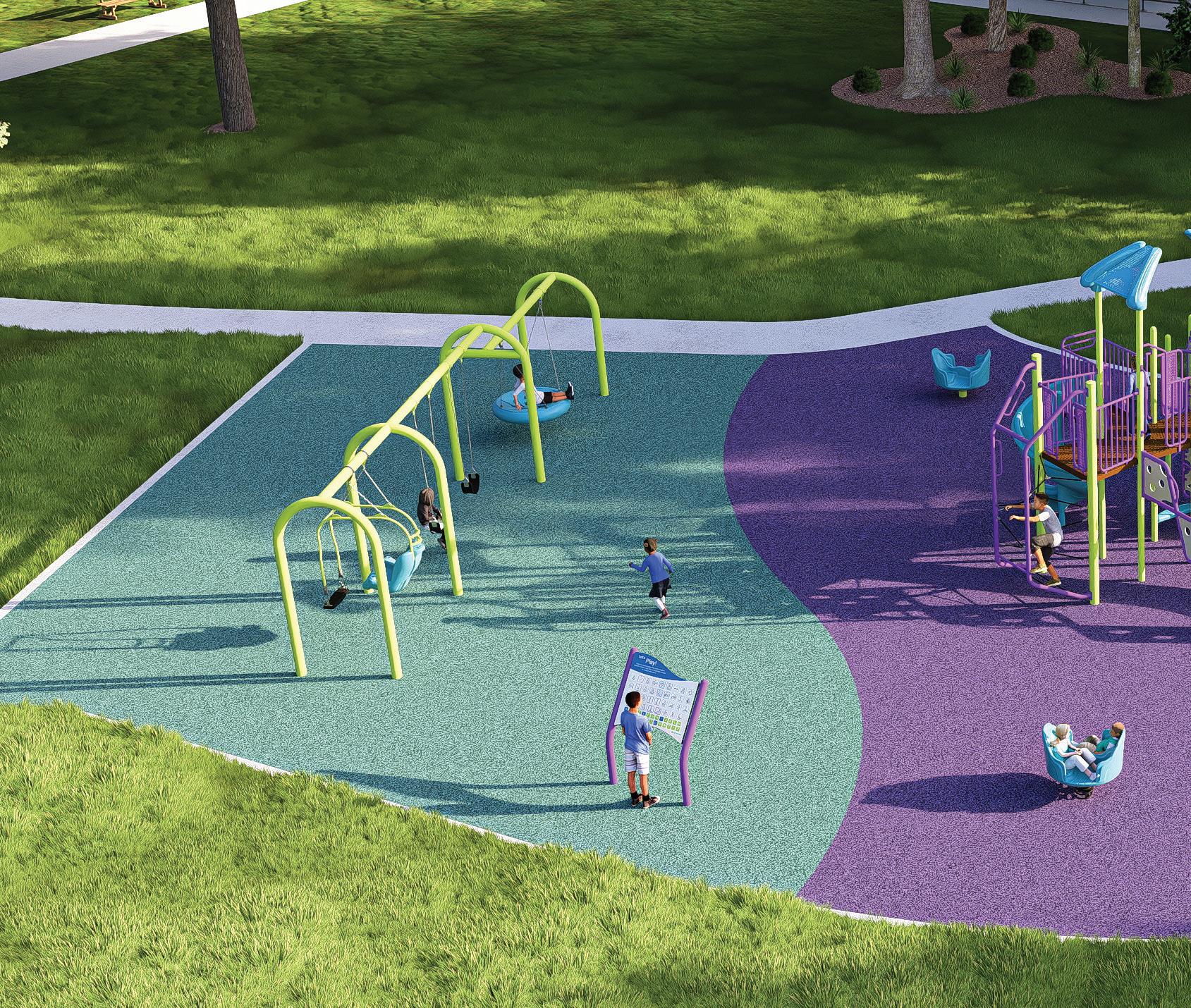 Playgrounds like this one utilize freestanding experiences to reduced congestion and accommodate more simultaneous users. Accessible poured-in-place rubber surfacing uses color to define different play zones, providing visual cues to help organize the environment so that it is easier to navigate and understand.