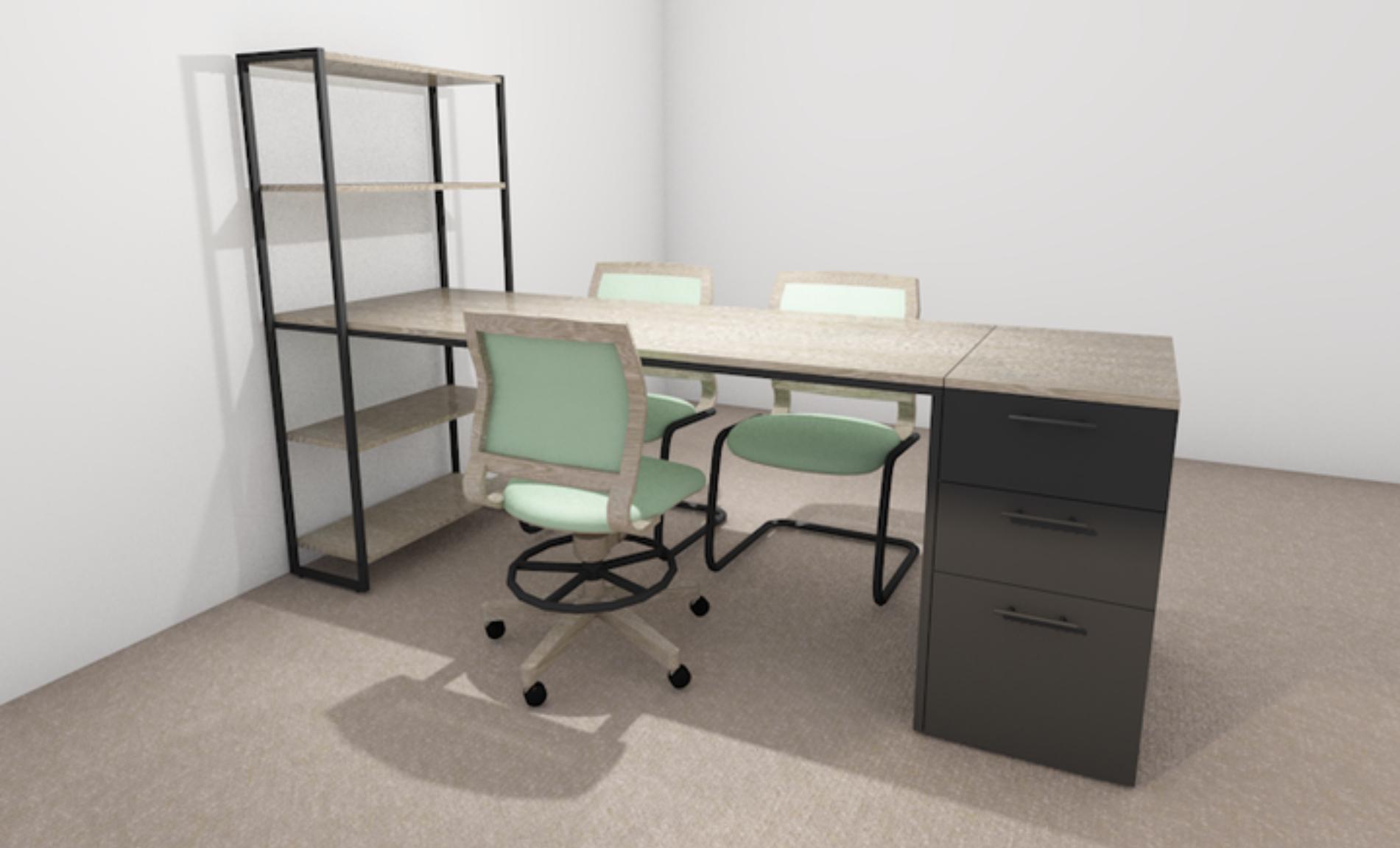 Este diseño busca la eficiencia espacialmediante la fragmentación de funciones. El escritorio integra una estantería lateral fija para soporte estructural y estético, mientras que la cajonera independiente permite flexibilidad en la configuración del espacio de trabajo.