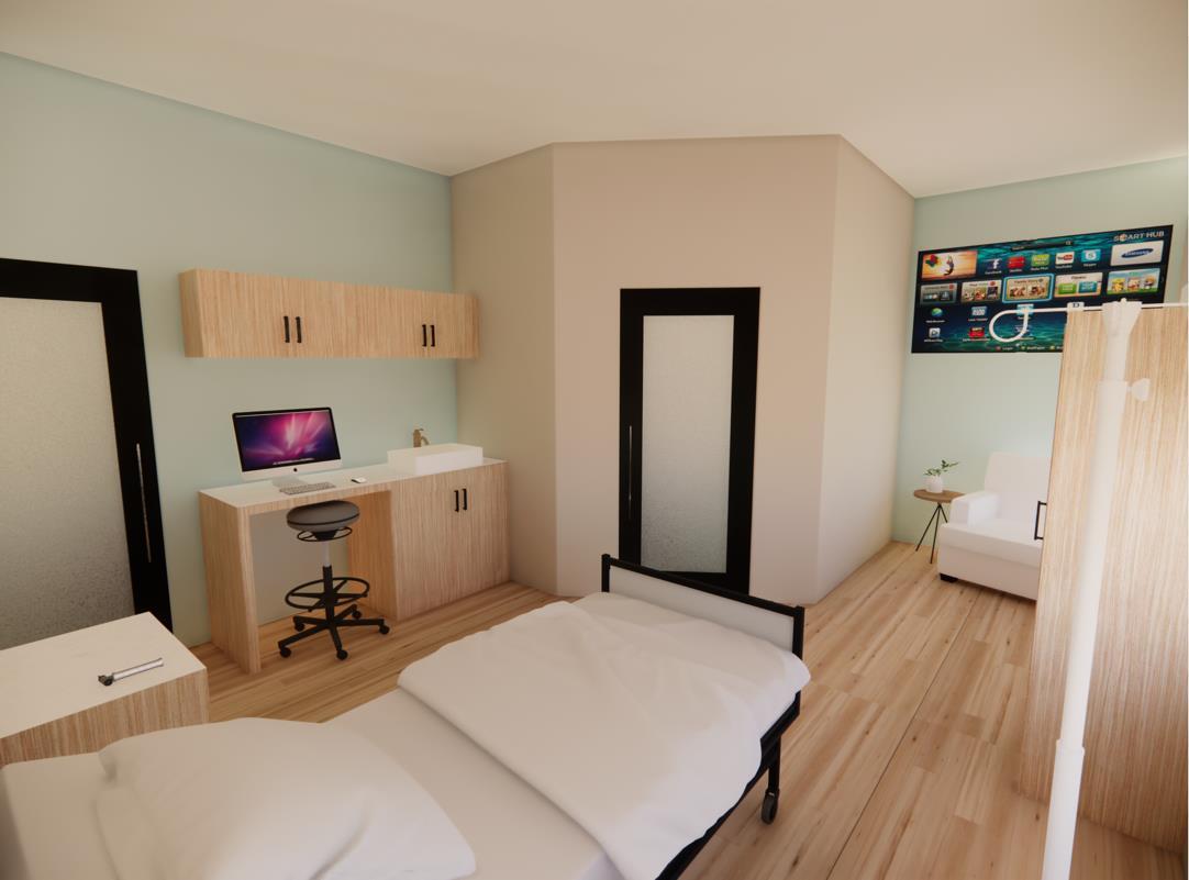 DesigningahospitalroomthatfollowsADAlawstoallowfor wheelchairboundpatientsandhasasoothingcolorpalettewhich isscientificallyproventoeasethepatients’mood.Biophilic designisincorporatedintothesametoprovideaserene atmosphere.Thisconceptaimstoprovidepatientswitha comfortingandupliftingspaceduringtheirvisit.