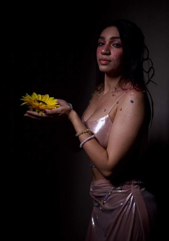 Our model? Wrapped in a pink metallic co-ord set that looks like it was stolen from a cyberpunk goddess. The fabric catches the sunlight, shifting like liquid metal. It’s giving futuristic mystic, an ethereal warrior stepping into ultimate awareness.