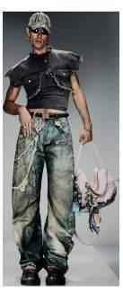 The ensembles, in this design language, oscillate between structured and fluid, adhering to no fixed gender norms. Tight-fitting tops create a contrast against baggy, washed-out denims, embracing wear and tear as a stylistic statement. Whether it’s distressed knits, deconstructed shirts, or shredded outerwear, add a sense of entropy, while leather and denim jackets exude a feeling of armoured defiance.