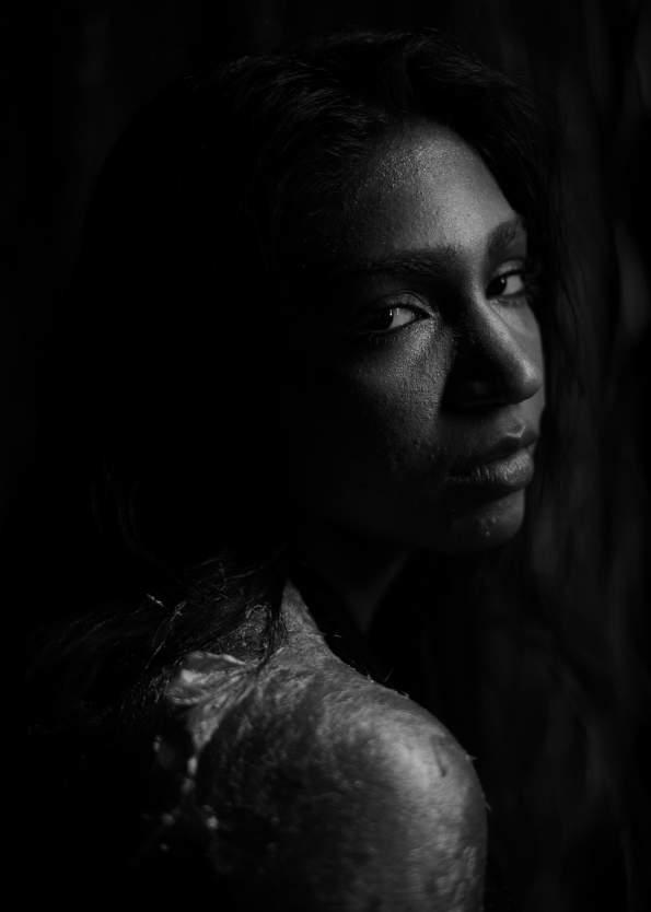 The subconscious is a moody place—equal parts eerie and enchanting. Our subject is draped in sheer, ghost-like layers, shimmering in silver like an alien goddess lost in a Black Mirror episode. The backdrop? Dark, dreamy, and slightly unsettling—think Euphoria meets a David Lynch fever dream.