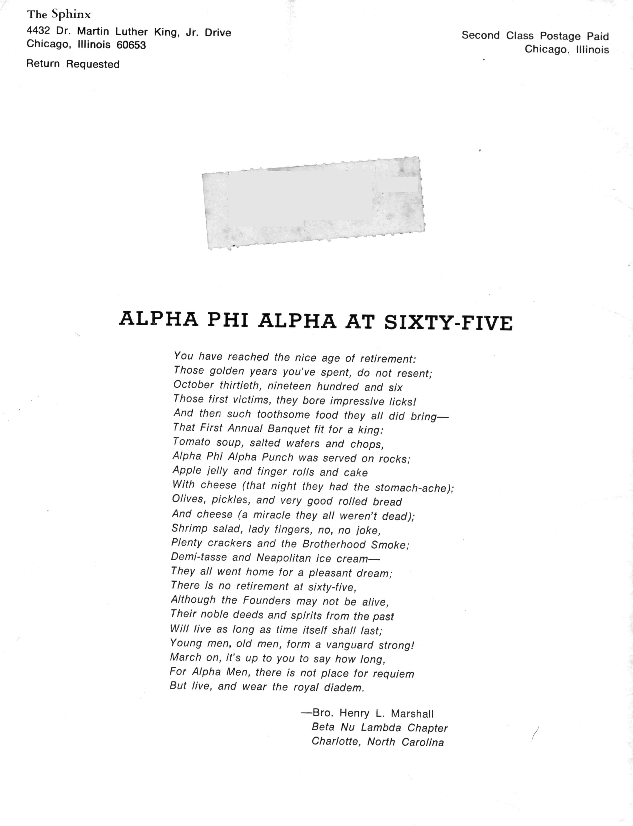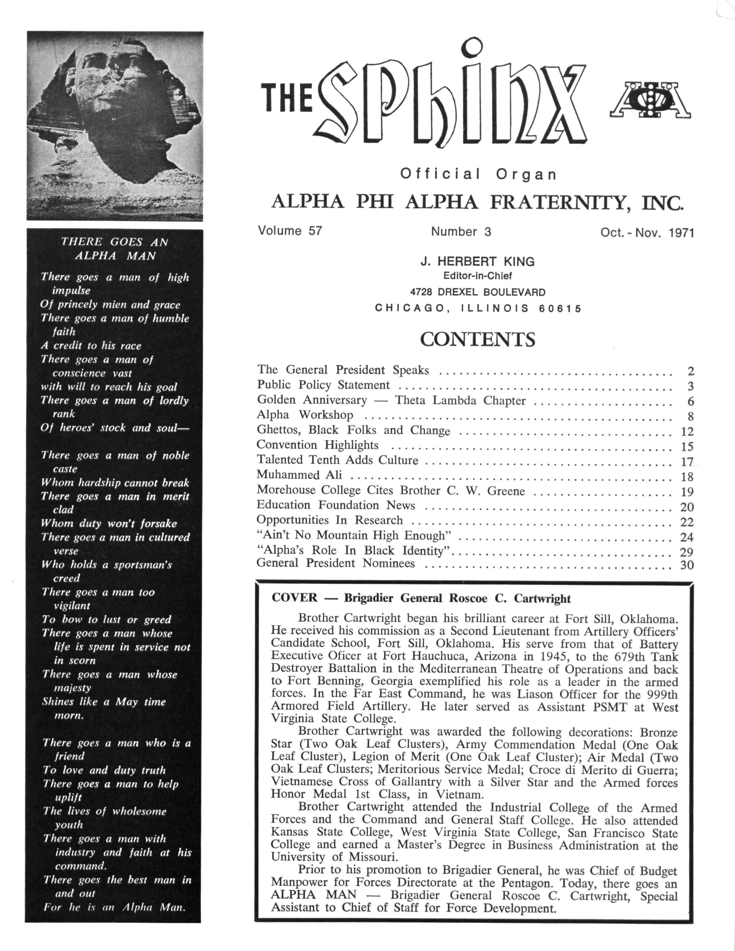 The Sphinx is the official magazine of the Alpha Phi Alpha Fraternity, Inc., 4432 Dr Martin Luther King Dr., Chicago, III., with editorial offices at 4728 Drexel Blvd., Chicago, III 60615 Published four times a year: February, May, October and December Address all editorial mail to 4728 Drexel Blvd., Chicago, III 60615 Change of Address: Send both addresses to Alpha Phi Alpha Fraternity, 4432 Dr Martin Luther King Drive, Chicago, III Manuscripts or art submitted to The Sphinx should be accompanied by addressed envelopes and return postage Editor assumes no responsibility for return of unsolicited manuscripts or art