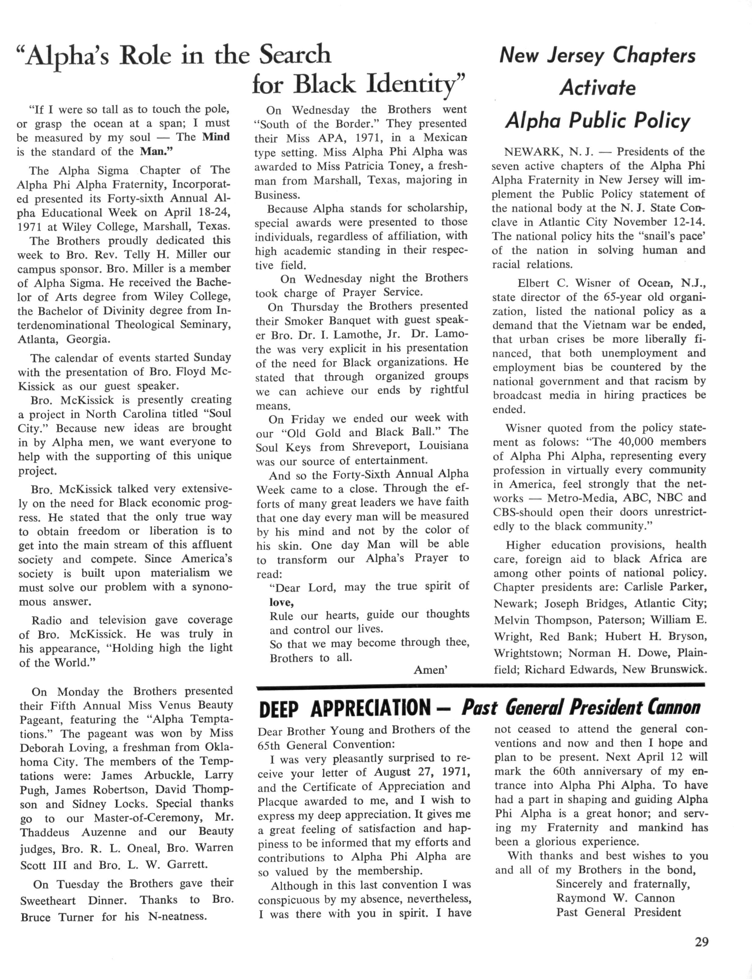 I was very pleasantly surprised to receive your letter of August 27, 1971, and the Certificate of Appreciation and Placque awarded to me, and I wish to express my deep appreciation. It gives me a great feeling of satisfaction and happiness to be informed that my efforts and contributions to Alpha Phi Alpha are so valued by the membership