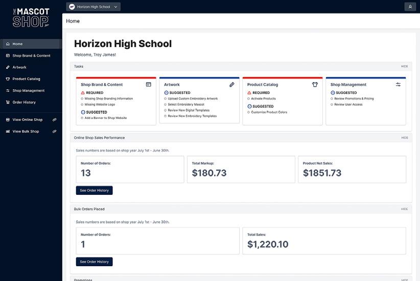 The free to use, all-in-one Mascot Shop platform saves you time, makes you money and drives school spirit year-round even when school’s out. The intuitive platform allows you to easily control your assortment of products, available graphics, bulk orders and community’s online buying experience. Transform your customizable merchandise into a powerful tool that creates community-wide connection.
