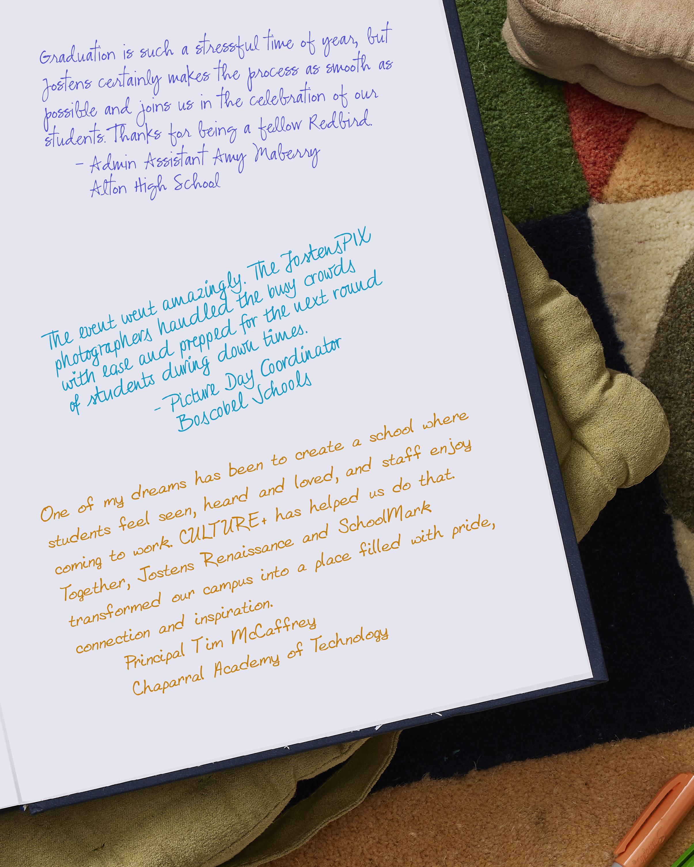 Our Jostens team is honored to help individual students and entire school communities celebrate what they’re most proud of and lean into their unique identities. We provide meaningful experiences that champion a culture of belonging, achievement and pride for school communities across the country.