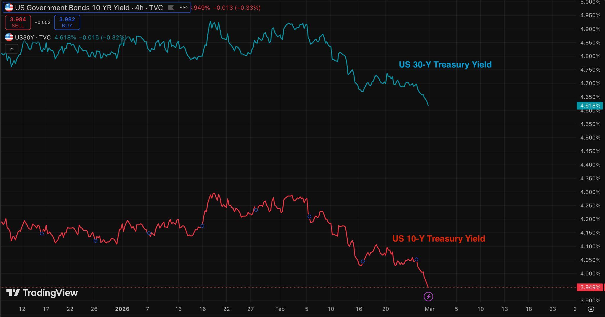 儘管第一季經濟成長預期超過 4%,且短期通膨可能升至 3% 以上,債券市場目前顯示短 期過度買盤跡象。若地緣政治風險進一步升高,對公債的需求可能持續增加,使殖利率跌 破部分分析師認為的合理價值水準。