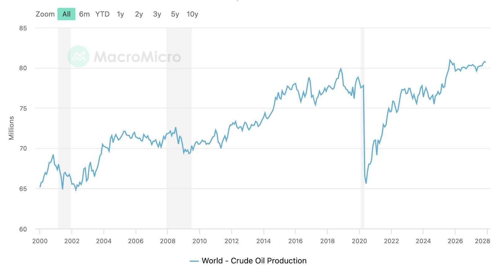 其次,全球產能規模明顯高於過往波斯灣衝突時期。當前原油產量約為每日 8,600 萬桶, 若納入天然氣液體、生質燃料與凝析油,總液態供給約達每日 1.035 億桶。2003 年第二 次波斯灣戰爭期間,原油產量僅約每日 7,100 萬桶。當今更高的產能彈性提供了對區域性 中斷的緩衝。