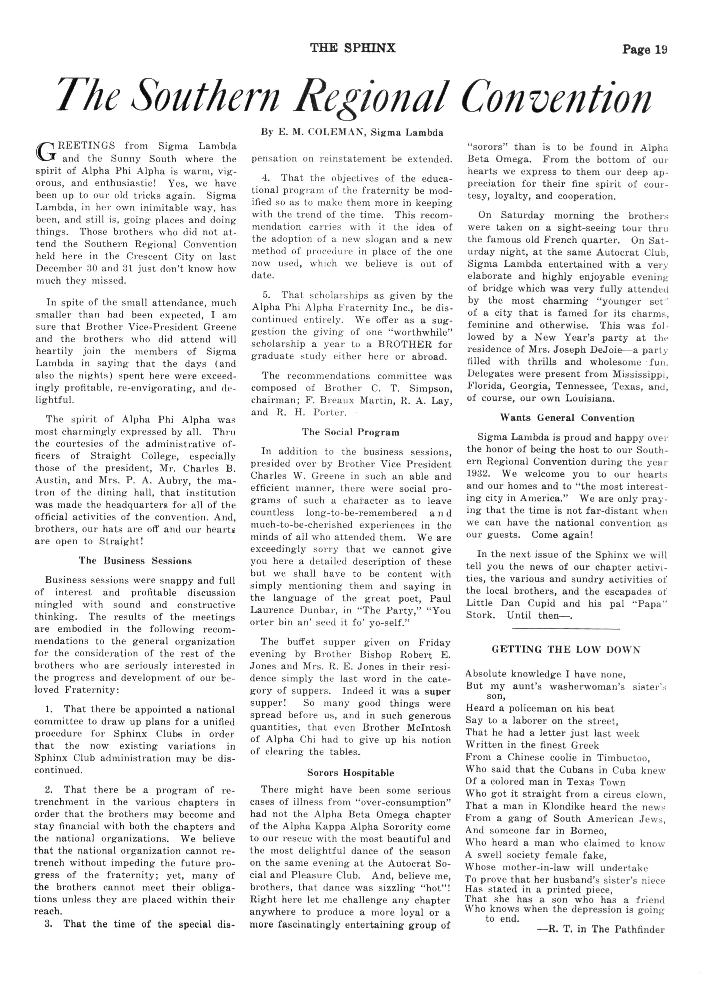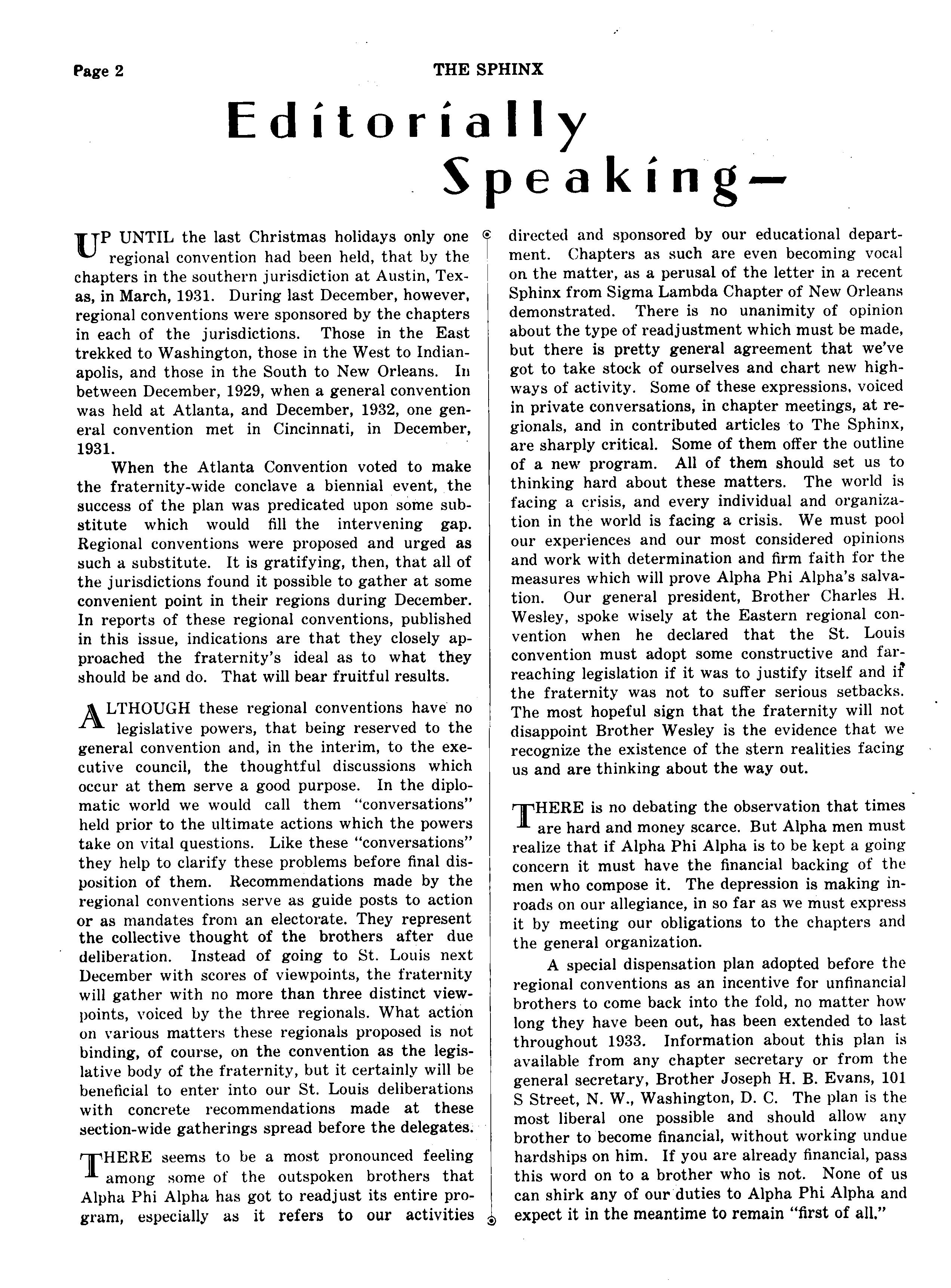 *^ regional convention had been held, that by the chapters in the southern jurisdiction at Austin, Texas, in March, 1931 During last December, however, regional conventions were sponsored by the chapters in each of the jurisdictions. Those in the East trekked to Washington, those in the West to Indianapolis, and those in the South to New Orleans In between December, 1929, when a general convention was held at Atlanta, and December, 1932, one general convention met in Cincinnati, in December, 1931.