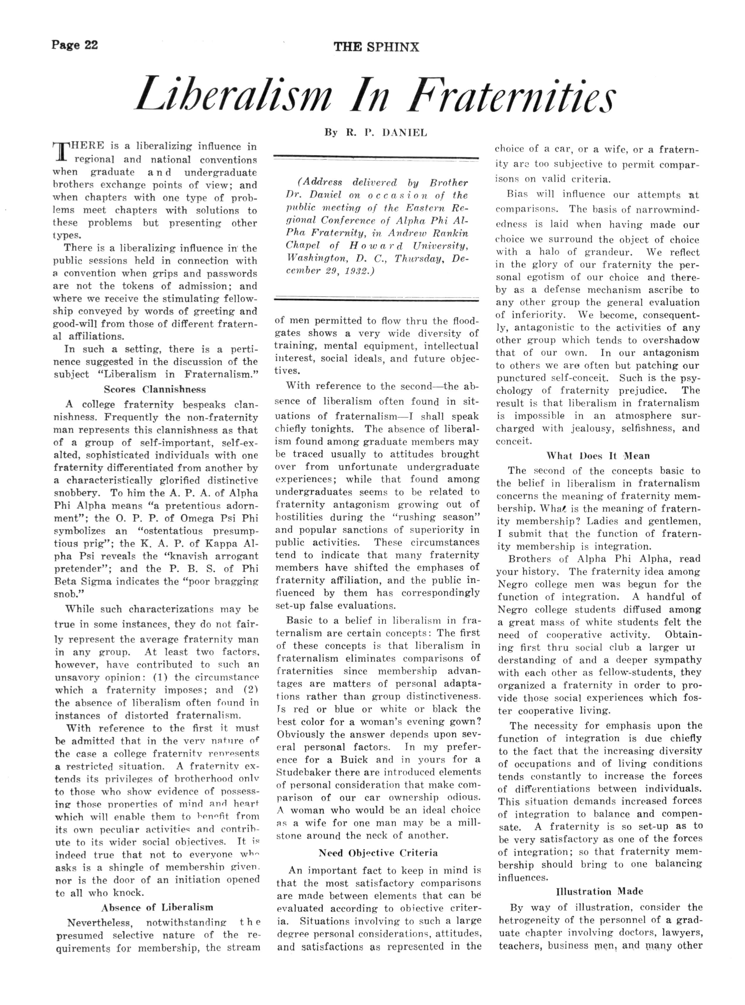 Welcome address delivered on behalf of Mu Lambda and Beta Chapters of Alpha Phi Alpha Fraternity: Eastern Regional Conference: Dec. 29, 19S2 rnpHE trite and obvious thing to say -i upon an occasion of this kind is that we are glad to welcome you to our great city, to all of the facilities of this Greater Howard University, and to the warm, fraternal hearts and throbbing affection of the brothers of Mu Lambda and Beta Chapters of Alpha Phi Alpha Fraternity It is with genuine sincerity we voice these sentiments