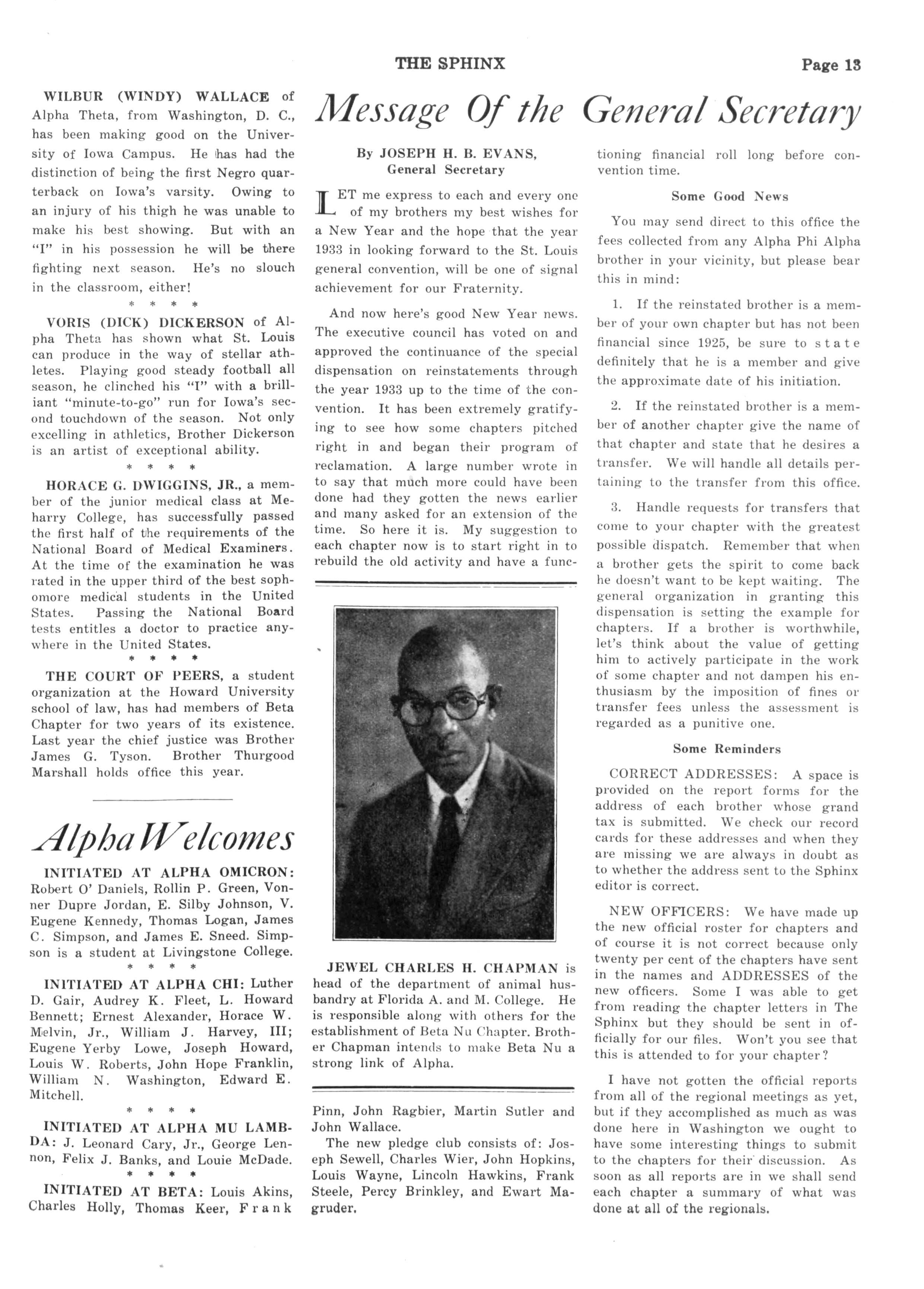 A special dispensation plan adopted before the regional conventions as an incentive for unfinancial brothers to come back into the fold, no matter how long they have been out, has been extended to last throughout 1933. Information about this plan is available from any chapter secretary or from the general secretary, Brother Joseph H B Evans, 101 S Street, N W., Washington, D C The plan is the most liberal one possible and should allow any brother to become financial, without working undue hardships on him If you are already financial, pass this word on to a brother who is not None of us can shirk any of our duties to Alpha Phi Alpha and expect it in the meantime to remain "first of all."
