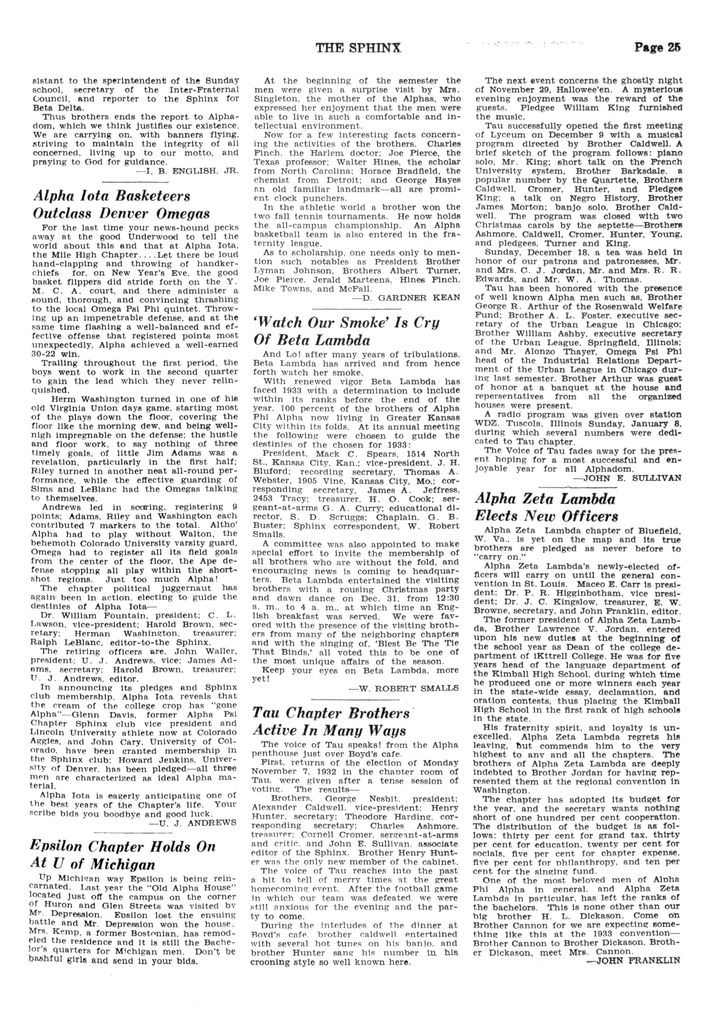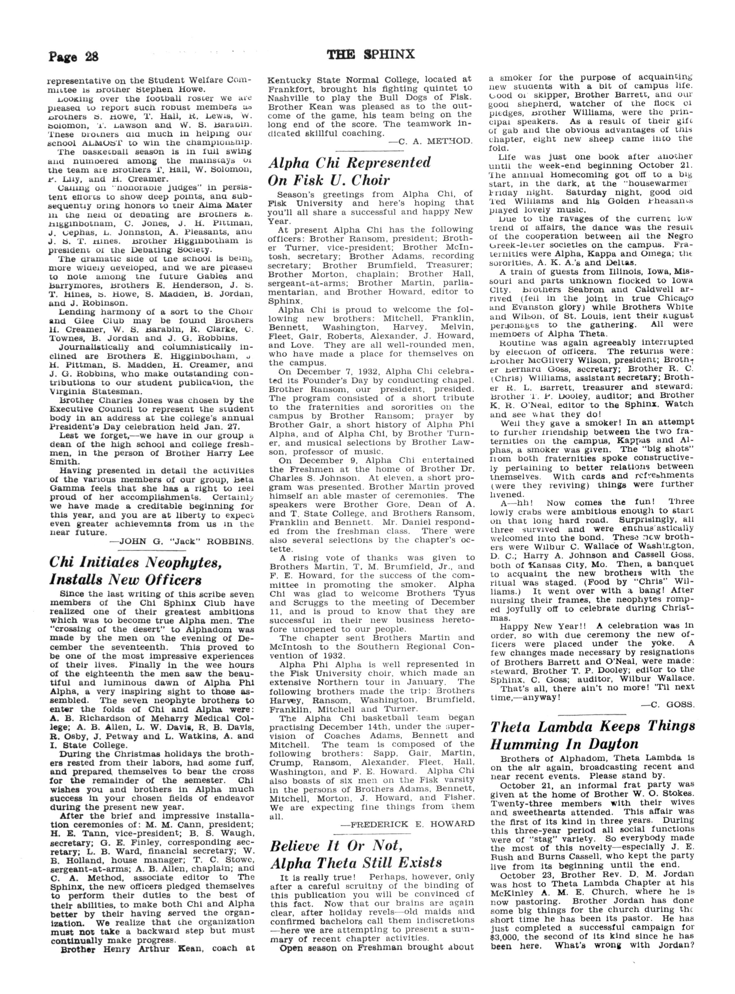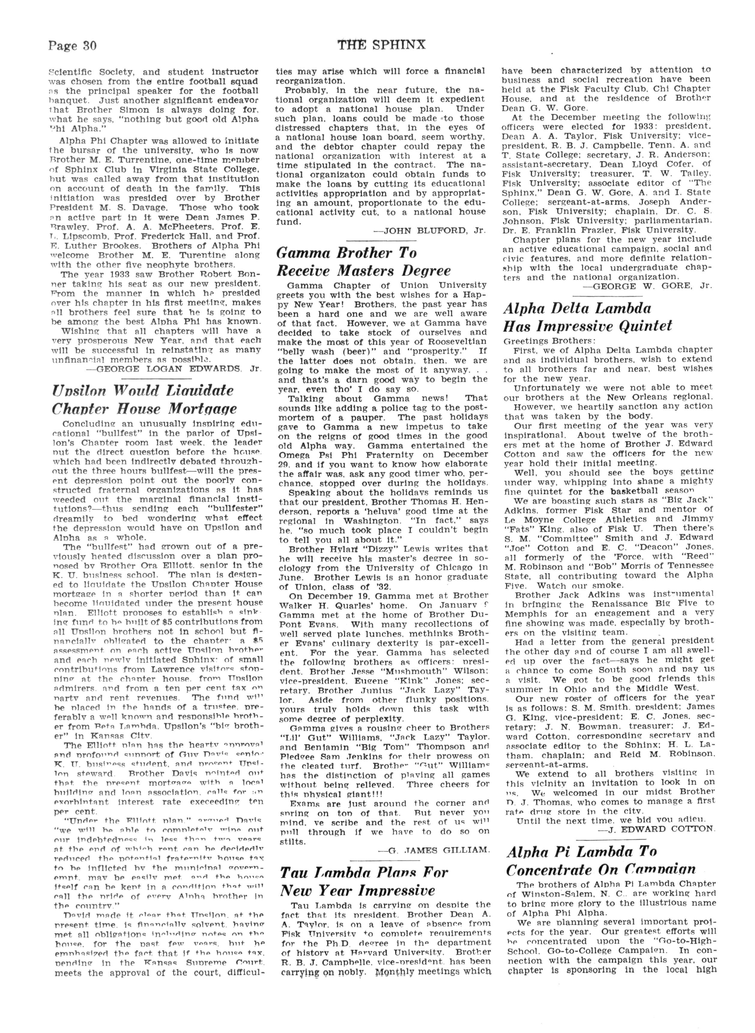 At the December meeting the following officers were elected for 1933: president Dean A A Taylor, Flsk University; vicepresident, R B J Campbelle Tenn A and T State College: secretary, J R Anderson: assistant-secretary, Dean Lloyd Cofer of Flsk University; treasurer T W Talley Fisk University; associate editor of "The Sphinx," Dean G W Gore, A and I State College: sergeant-at-arms Joseph Anderson, Fisk University; chaplain Dr C S Johnson Fisk University; parliamentarian Dr E Franklin Frazler Fisk University