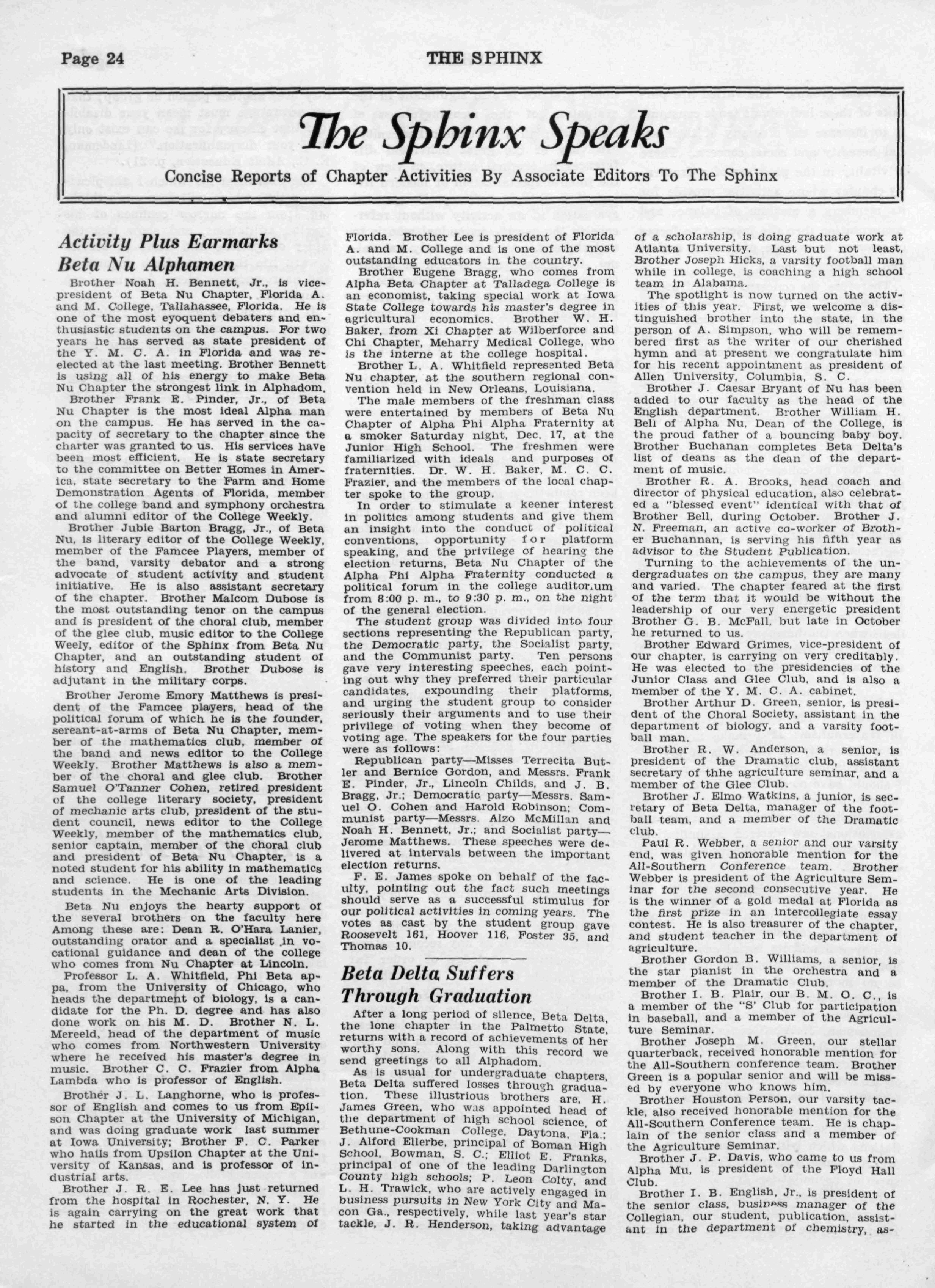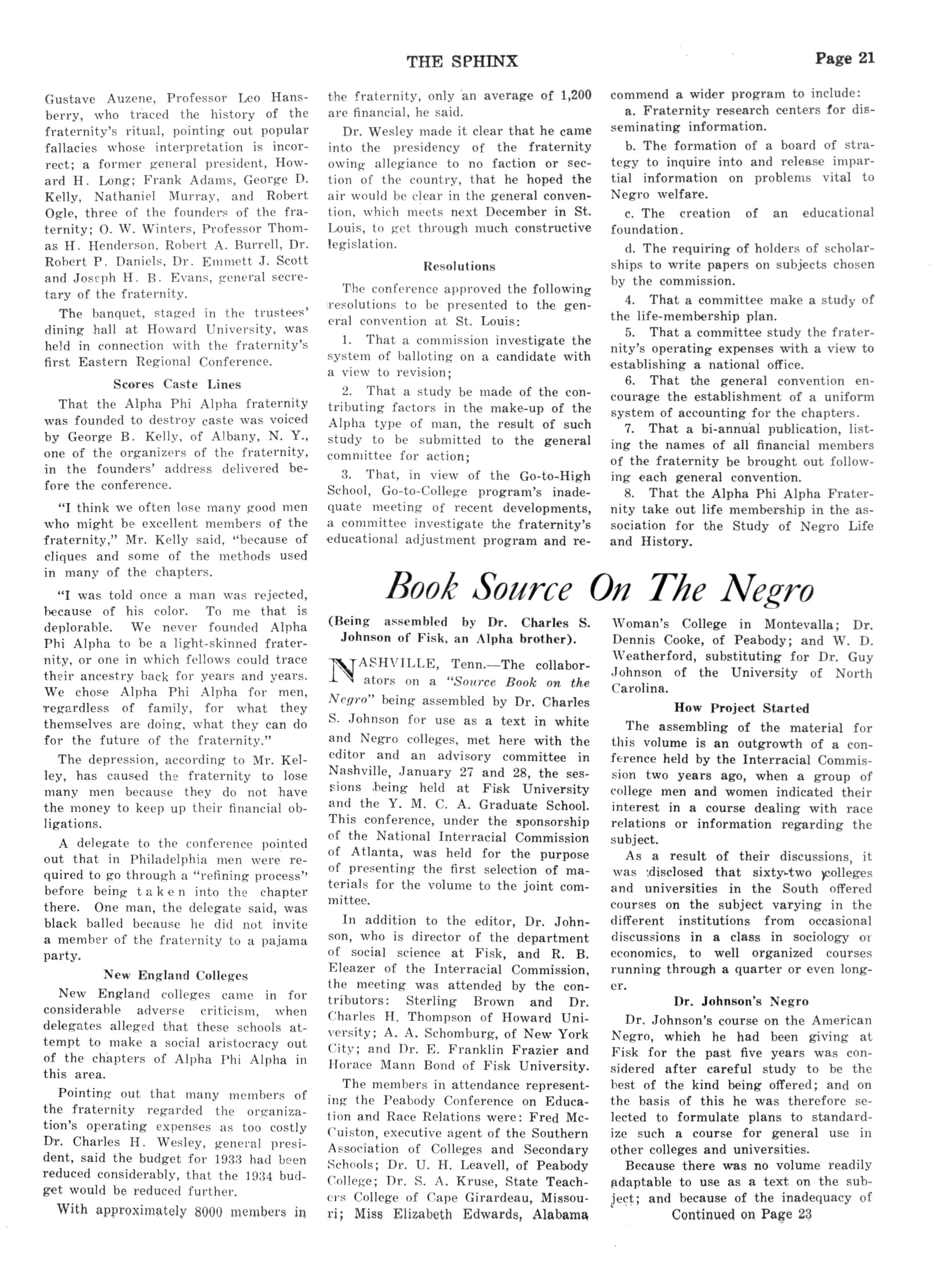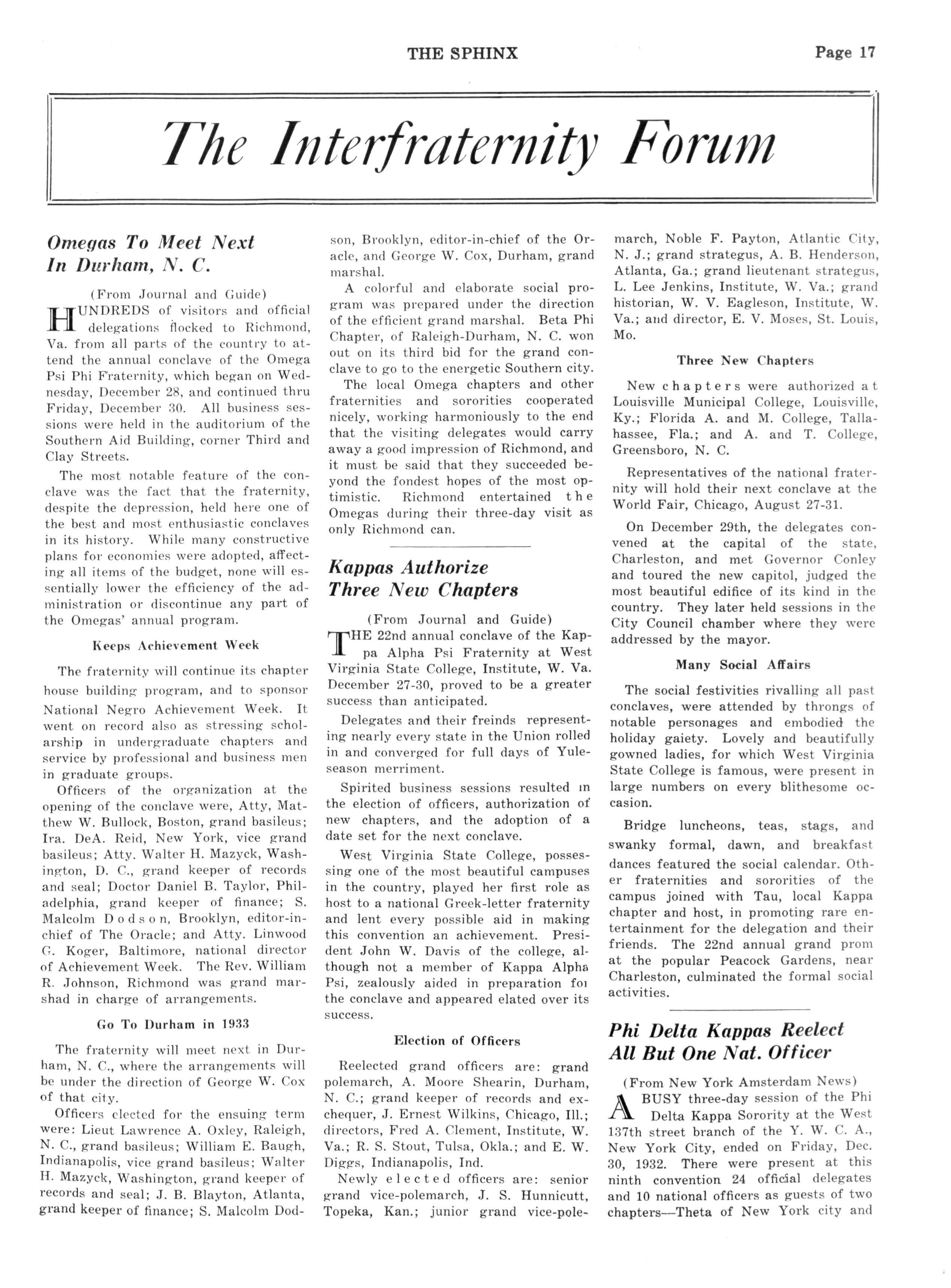 At the December meeting the following officers were elected for 1933: president Dean A A Taylor, Flsk University; vicepresident, R B J Campbelle Tenn A and T State College: secretary, J R Anderson: assistant-secretary, Dean Lloyd Cofer of Flsk University; treasurer T W Talley Fisk University; associate editor of "The Sphinx," Dean G W Gore, A and I State College: sergeant-at-arms Joseph Anderson, Fisk University; chaplain Dr C S Johnson Fisk University; parliamentarian Dr E Franklin Frazler Fisk University