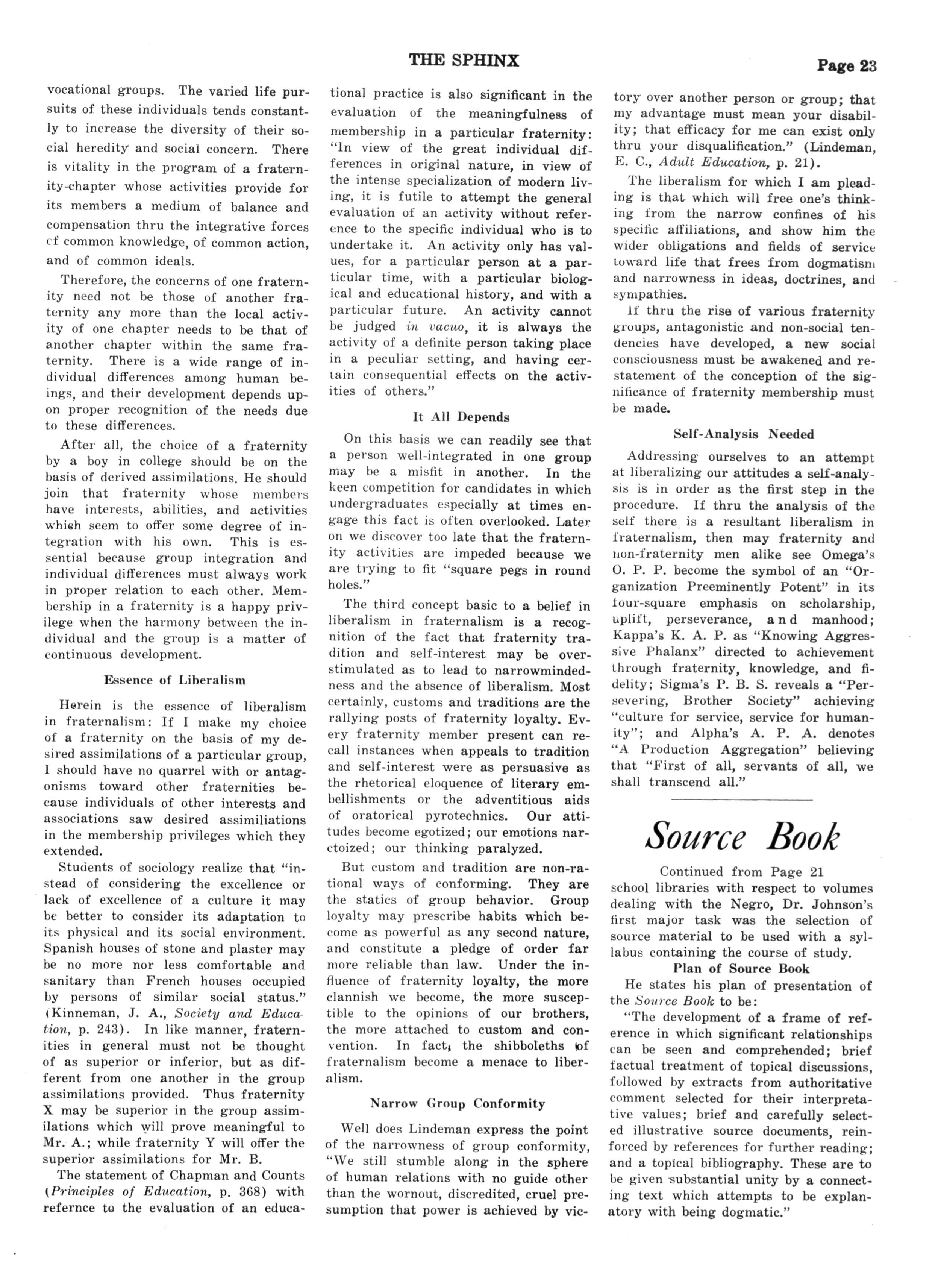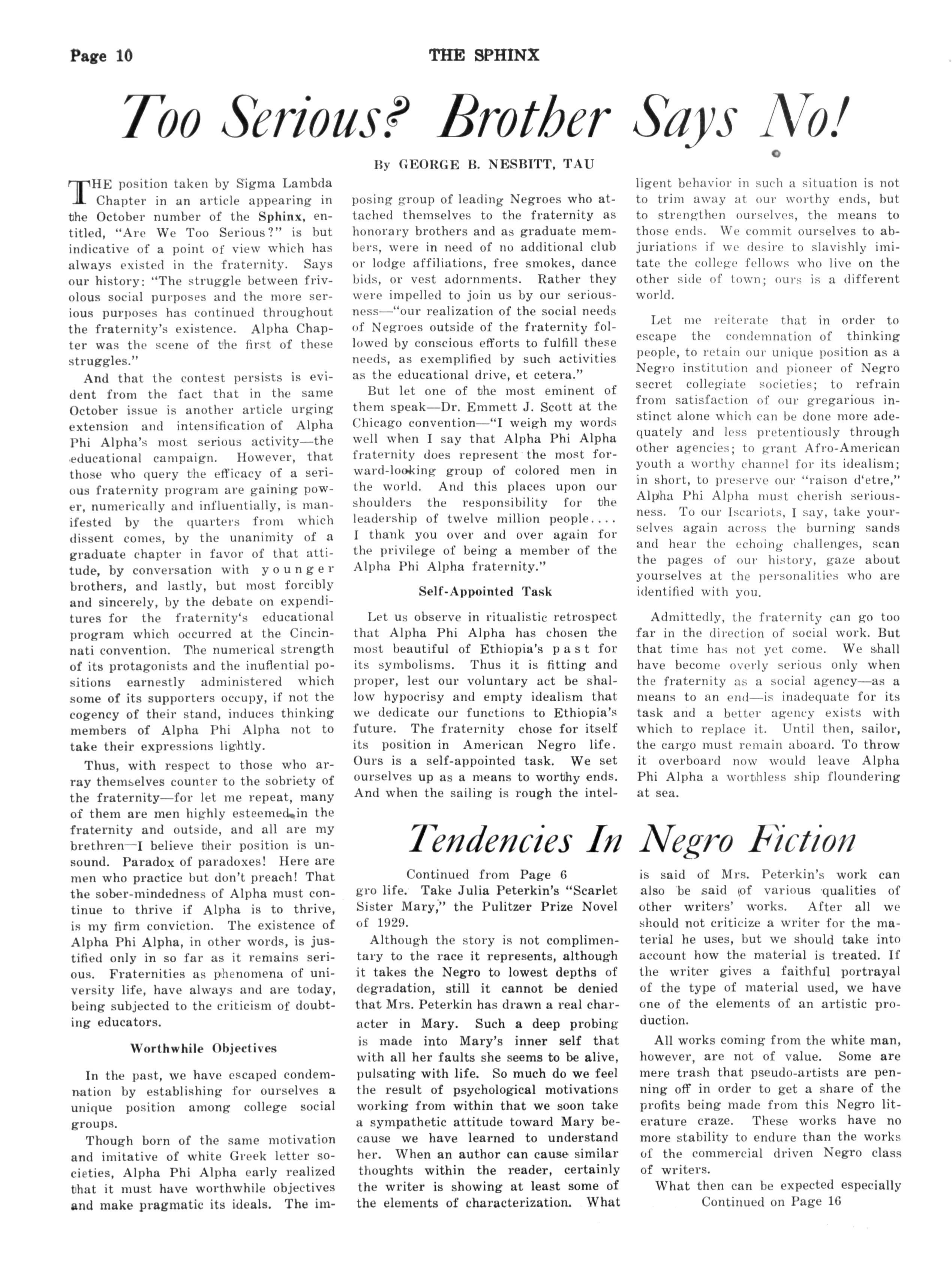 directed and sponsored by our educational department. Chapters as such are even becoming vocal on the matter, as a perusal of the letter in a recent Sphinx from Sigma Lambda Chapter of New Orleans demonstrated. There is no unanimity of opinion about the type of readjustment which must be made, but there is pretty general agreement that we've got to take stock of ourselves and chart new highways of activity Some of these expressions, voiced in private conversations, in chapter meetings, at regionals, and in contributed articles to The Sphinx, are sharply critical. Some of them offer the outline of a new program All of them should set us to thinking hard about these matters The world is facing a crisis, and every individual and organization in the world is facing a crisis. We must pool our experiences and our most considered opinions and work with determination and firm faith for the measures which will prove Alpha Phi Alpha's salvation Our general president, Brother Charles H Wesley, spoke wisely at the Eastern regional convention when he declared that the St. Louis convention must adopt some constructive and farreaching legislation if it was to justify itself and it the fraternity was not to suffer serious setbacks The most hopeful sign that the fraternity will not disappoint Brother Wesley is the evidence that we recognize the existence of the stern realities facing us and are thinking about the way out