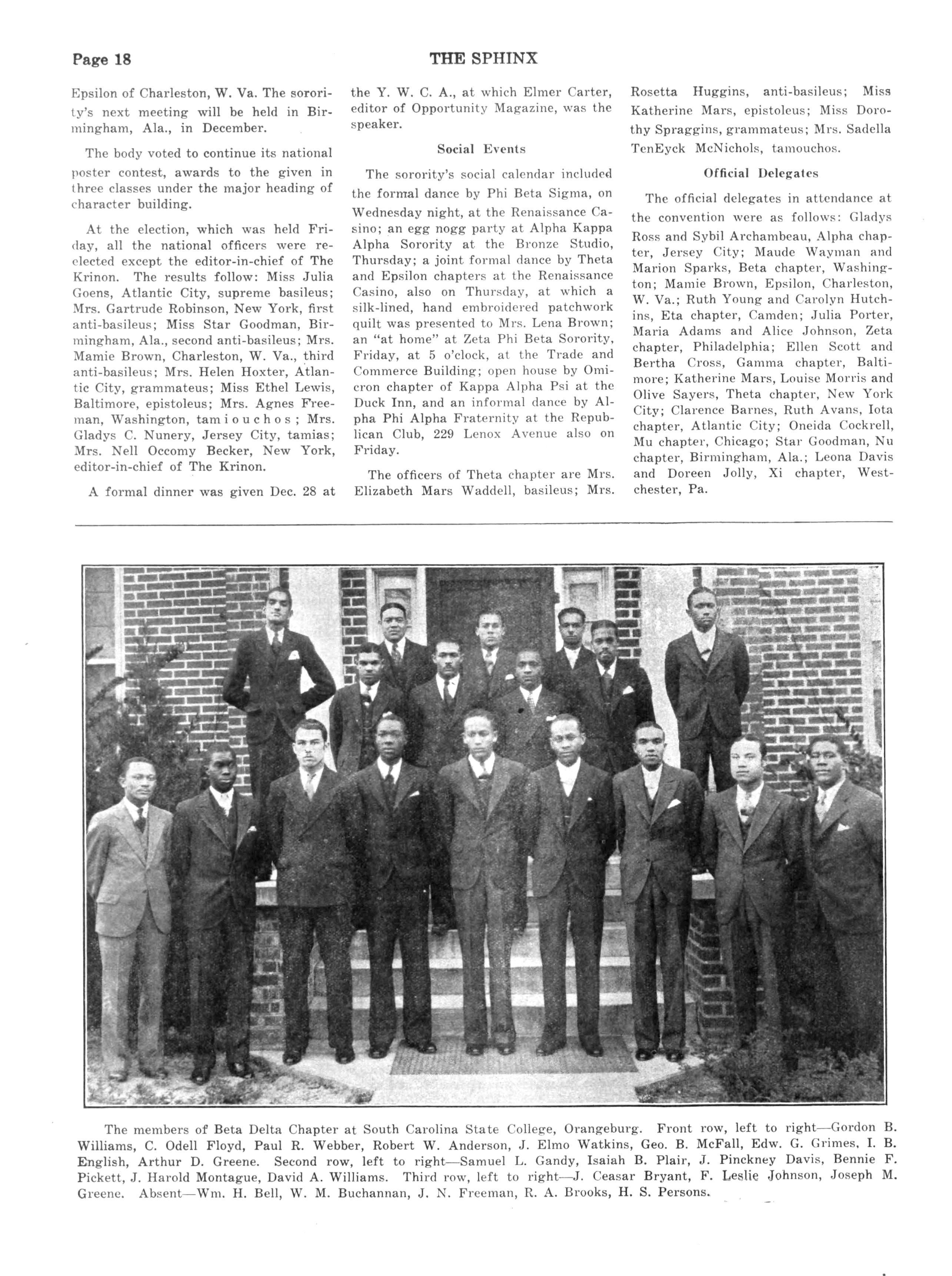 BETA DELTA, South Carolina State College, Orangeburg, S C; Pres., George McFall; Sec'y., Elmo J. Watklns.