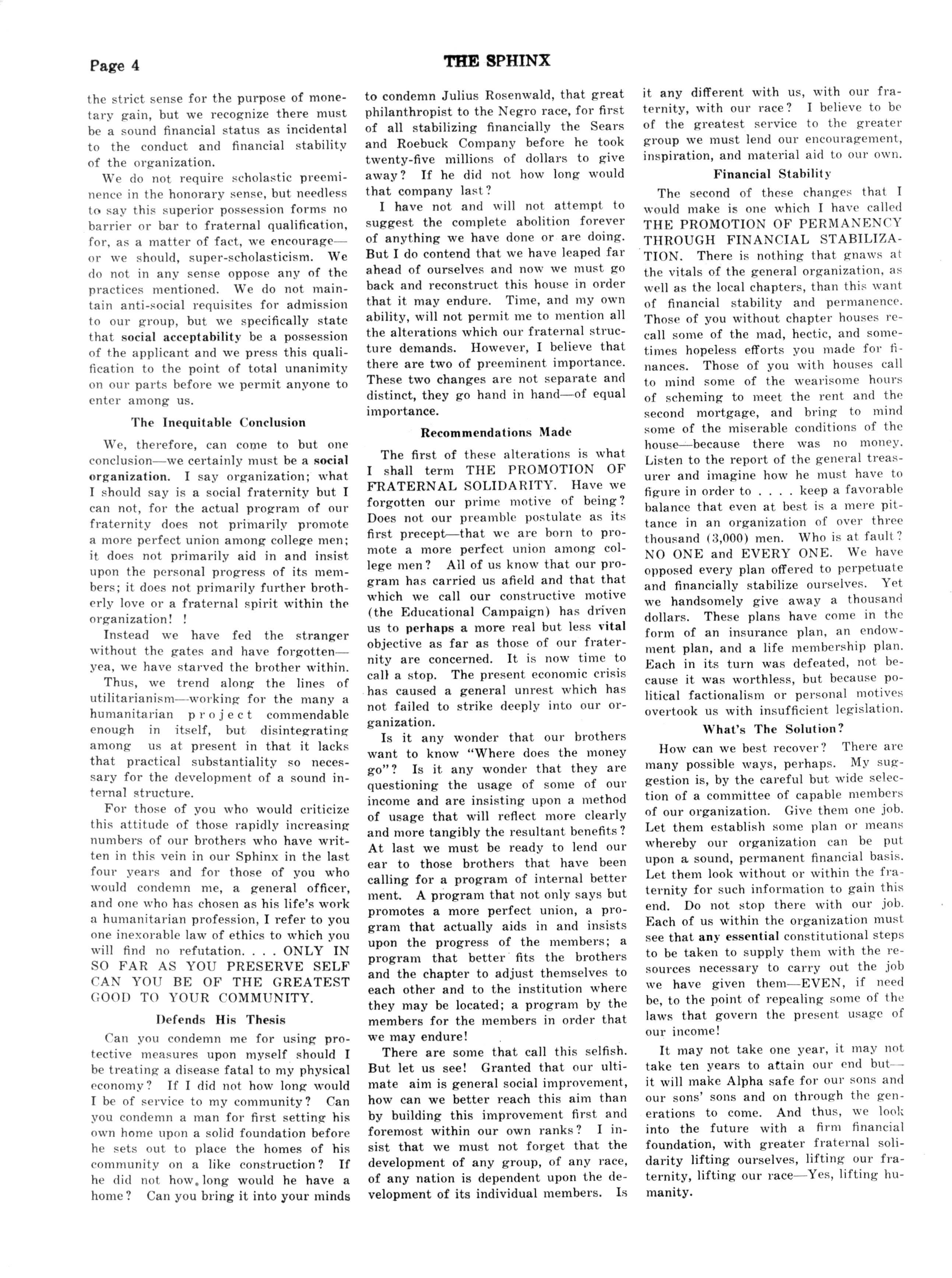 nnHERE is no debating the observation that times -"- are hard and money scarce But Alpha men must realize that if Alpha Phi Alpha is to be kept a going concern it must have the financial backing of the men who compose it. The depression is making inroads on our allegiance, in so far as we must express it by meeting our obligations to the chapters and the general organization
