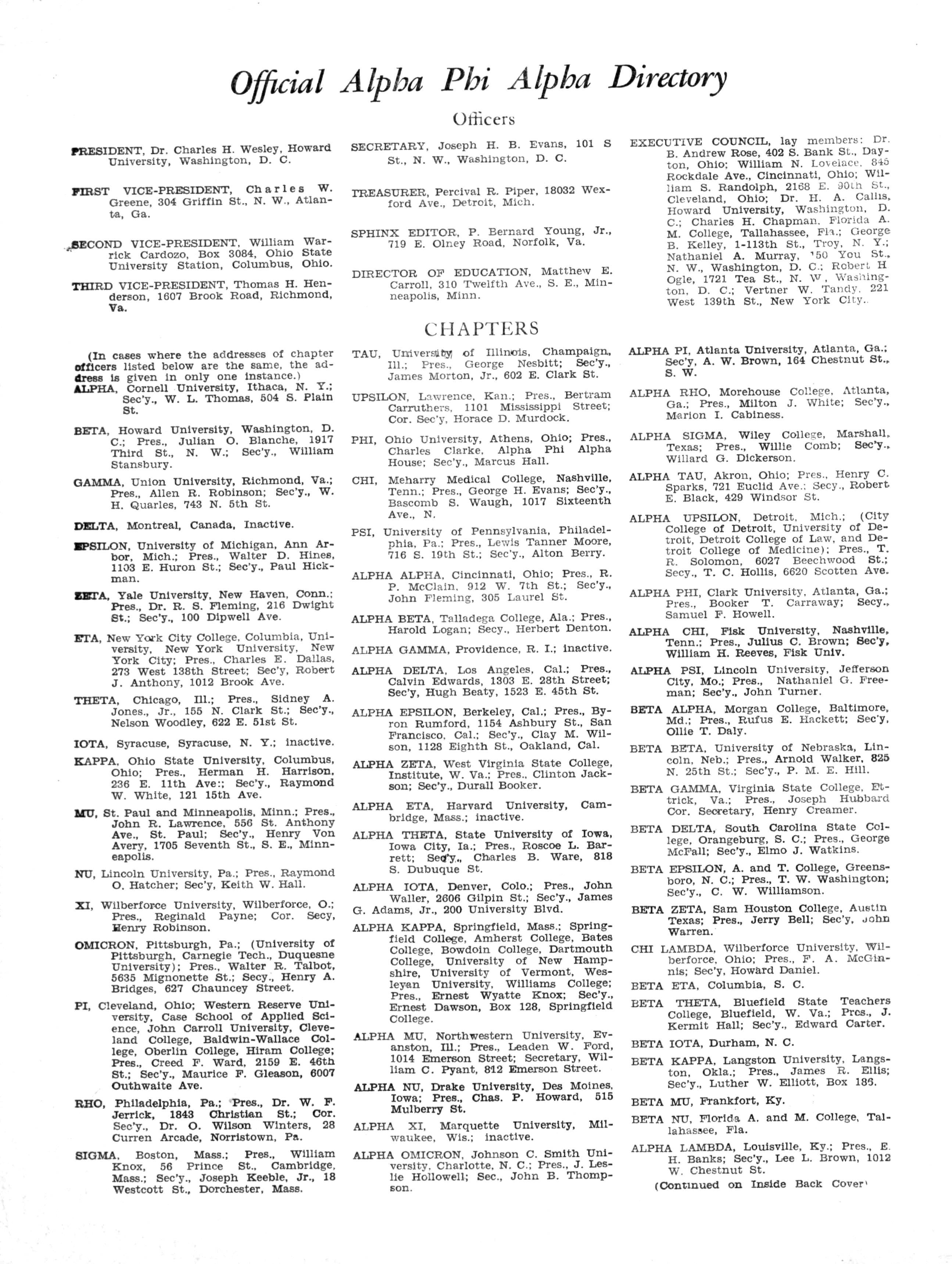 PHI, Ohio University, Athens, Ohio; Pres., Charles Clarke, Alpha Phi Alpha House; Sec'y., Marcus Hall