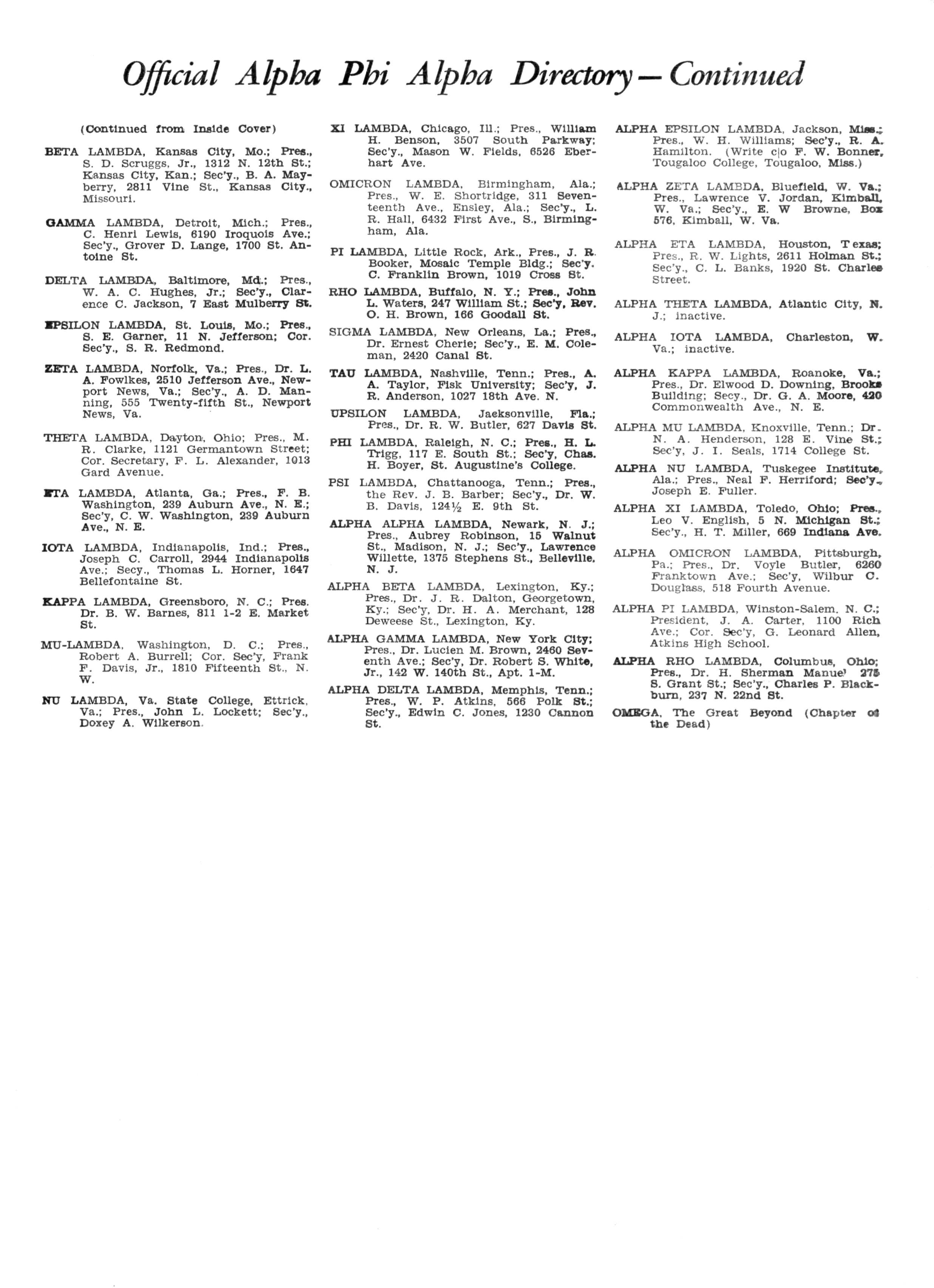 BETA LAMBDA, Kansas City, Mo.; Pres., S. D. Scruggs, Jr., 1312 N. 12th St.; Kansas City, Kan.; Sec'y., B A Mayberry, 2811 Vine St., Kansas City., Missouri