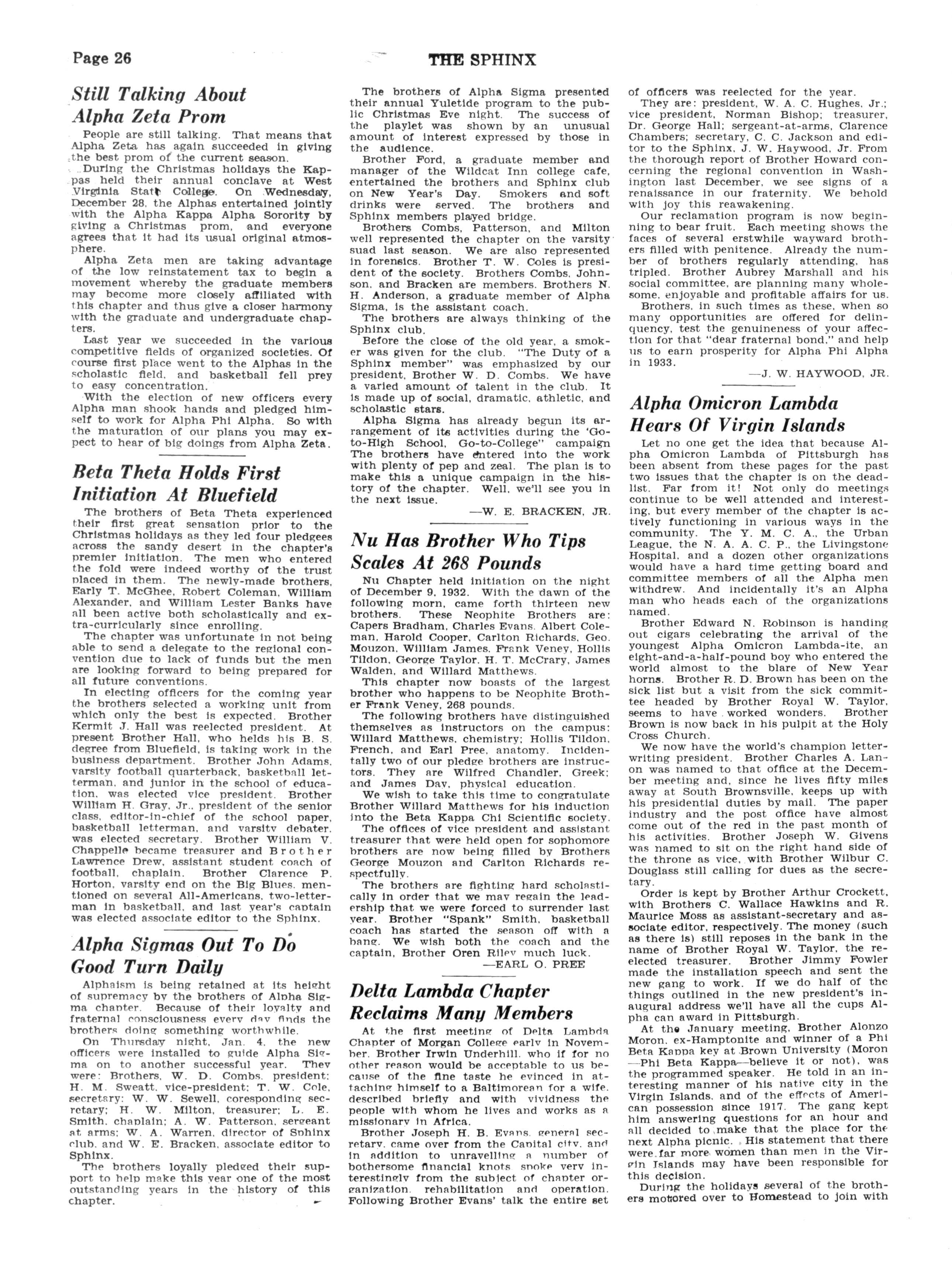 We are boasting such stars as "Big Jack" Adkins. former Fisk Star and mentor of Le Moyne College Athletics and Jimmy "Fats" King, also of Fisk U. Then there's S. M. "Committee" Smith and J. Edward "Joe" Cotton and E. C. "Deacon" Jones. all formerly of the 'Force, with "Reed" M. Robinson and "Bob" Morris of Tennessee State, all contributing toward the Alpha Five. Watch our smoke.