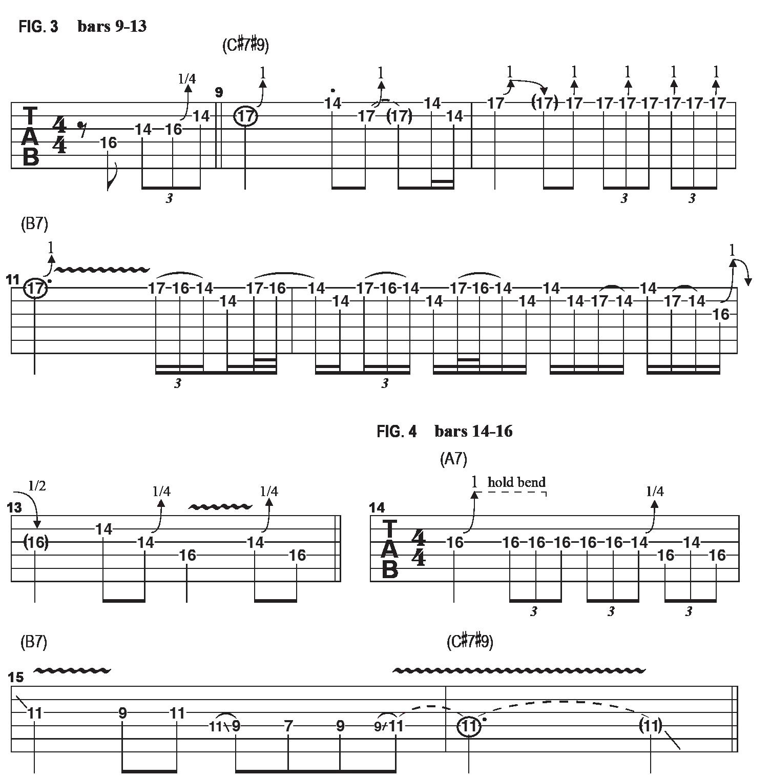 Now, if you really want to make enemies, go full bridge pickup with all the treble possible, as I do for the licks offered in FIGURE 3. This example is also in the key of B, and I quickly shift from 10th to 14th and 17th