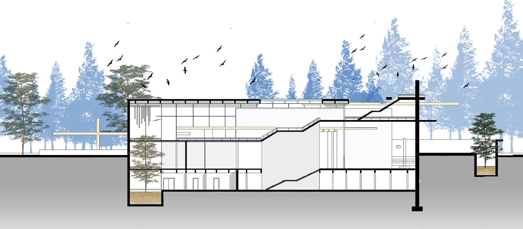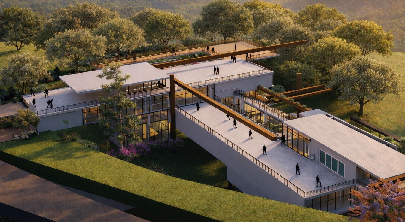 The design is organized around a primary vertical mass that forms the structural core, with horizontal hanging volumes extending toward the landscape to create a dynamic spatial experience and gradual, immersive transitions for users.