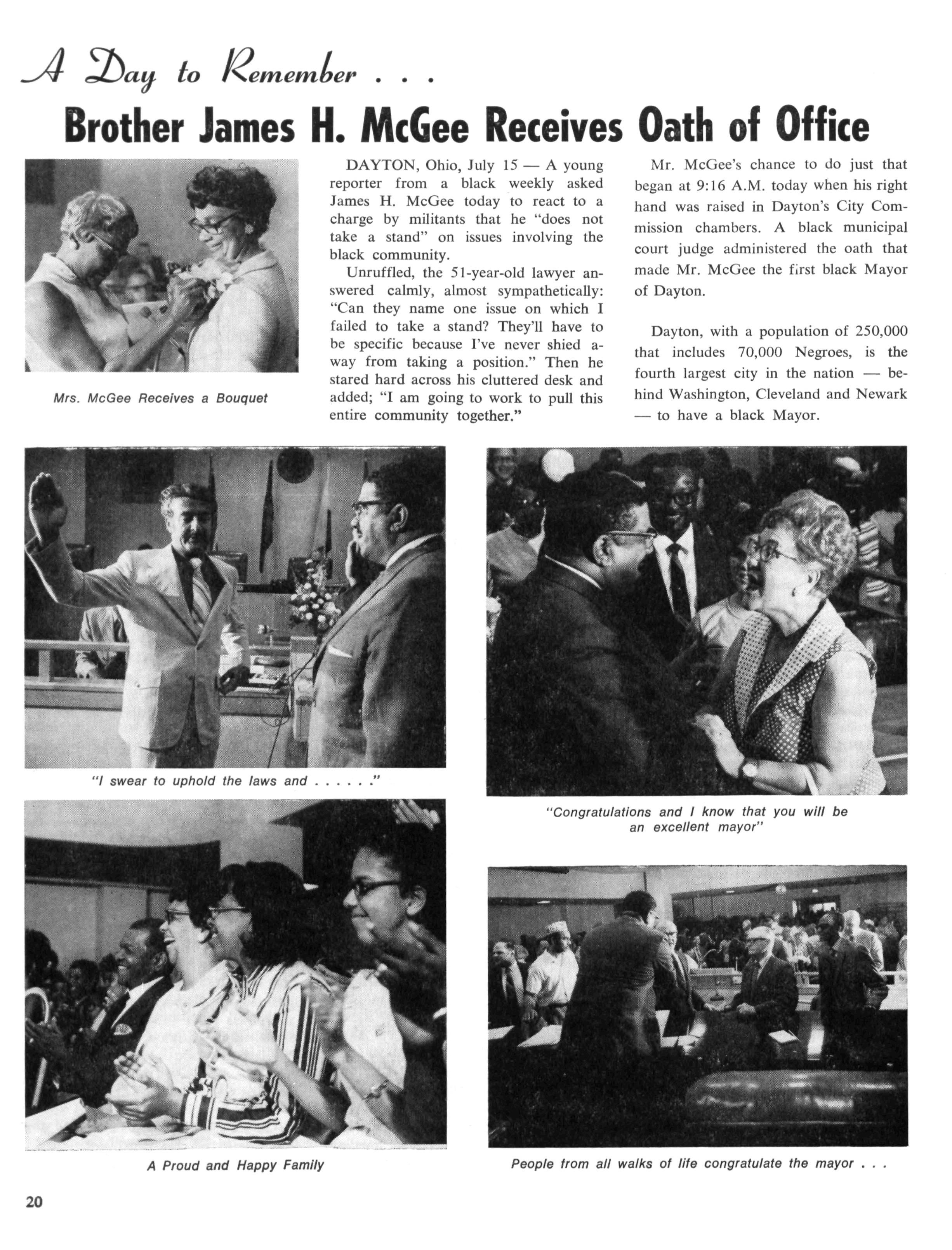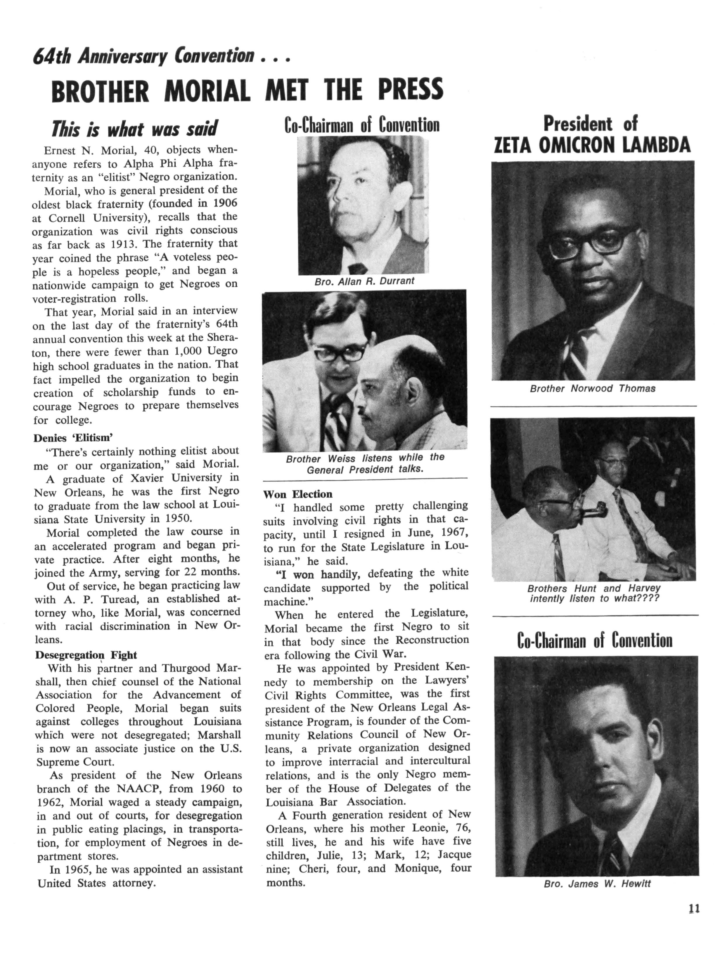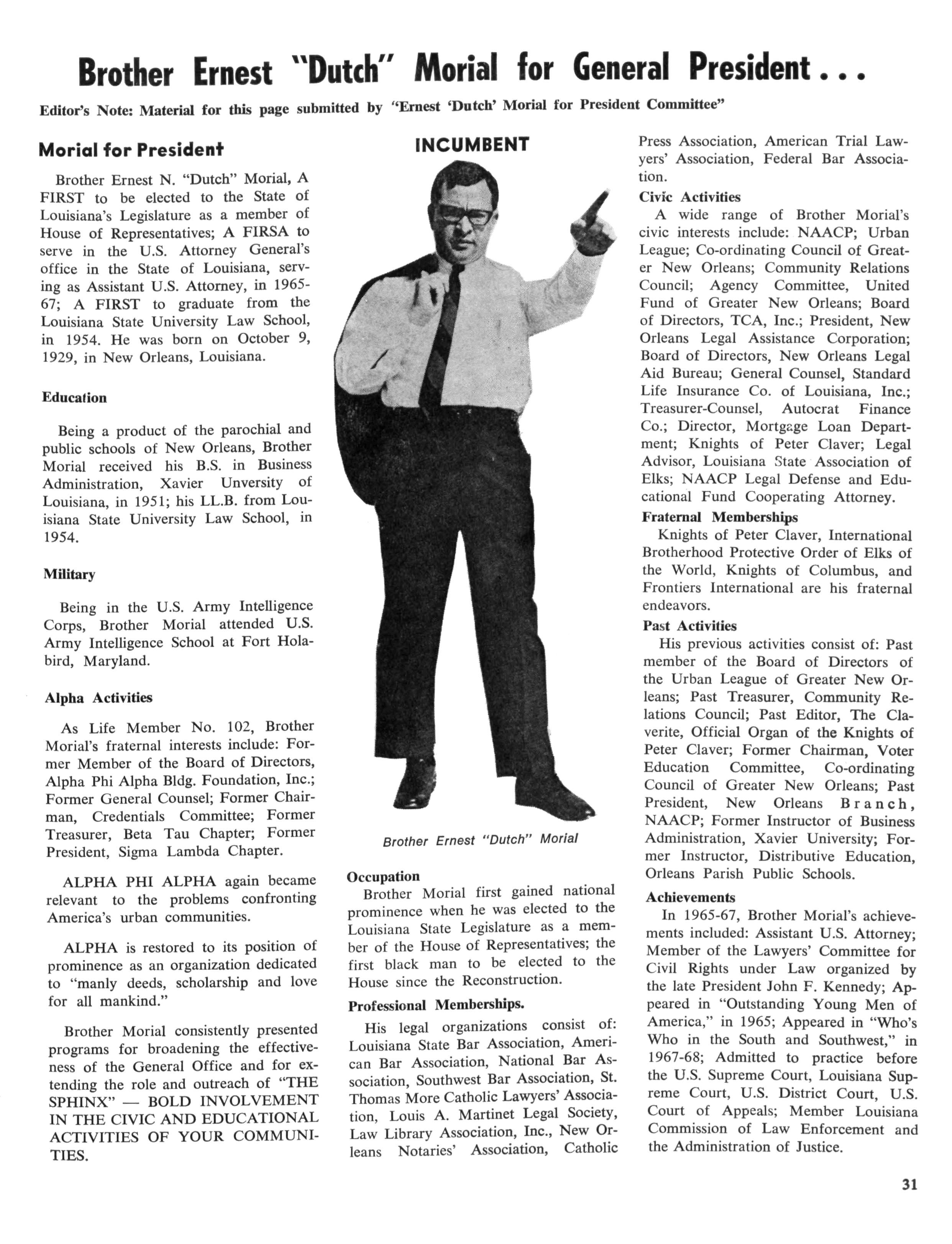 A wide range of Brother Morial's civic interests include: NAACP; Urban League; Co-ordinating Council of Greater New Orleans; Community Relations Council; Agency Committee, United Fund of Greater New Orleans; Board of Directors, TCA, Inc.; President, New Orleans Legal Assistance Corporation; Board of Directors, New Orleans Legal Aid Bureau; General Counsel, Standard Life Insurance Co of Louisiana, Inc.; Treasurer-Counsel, Autocrat Finance Co.; Director, Mortgage Loan Department; Knights of Peter Claver; Legal Advisor, Louisiana State Association of Elks; NAACP Legal Defense and Educational Fund Cooperating Attorney Fraternal Memberships