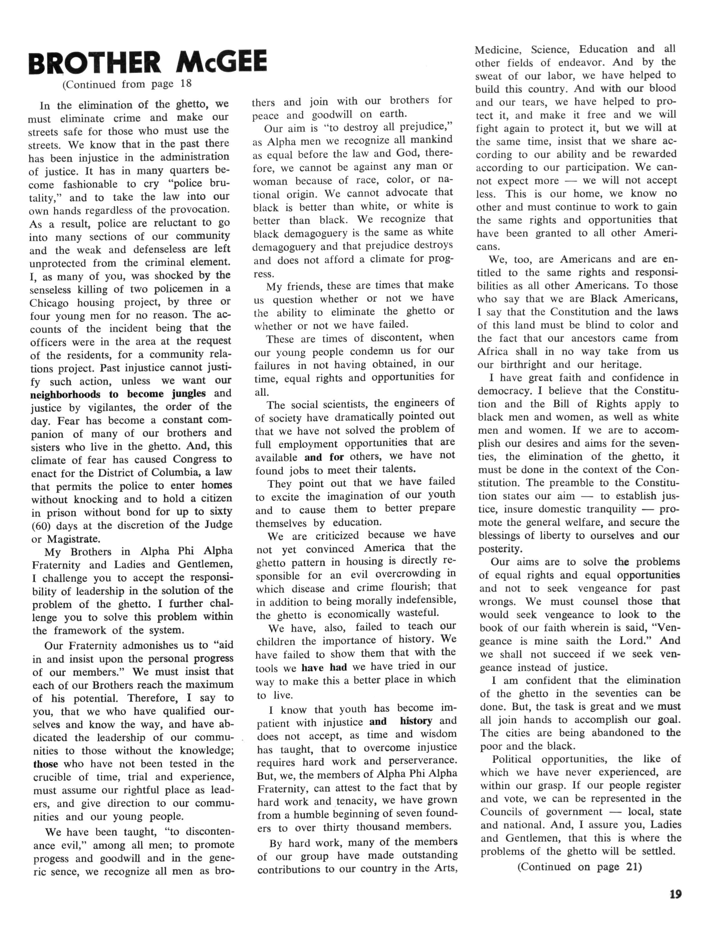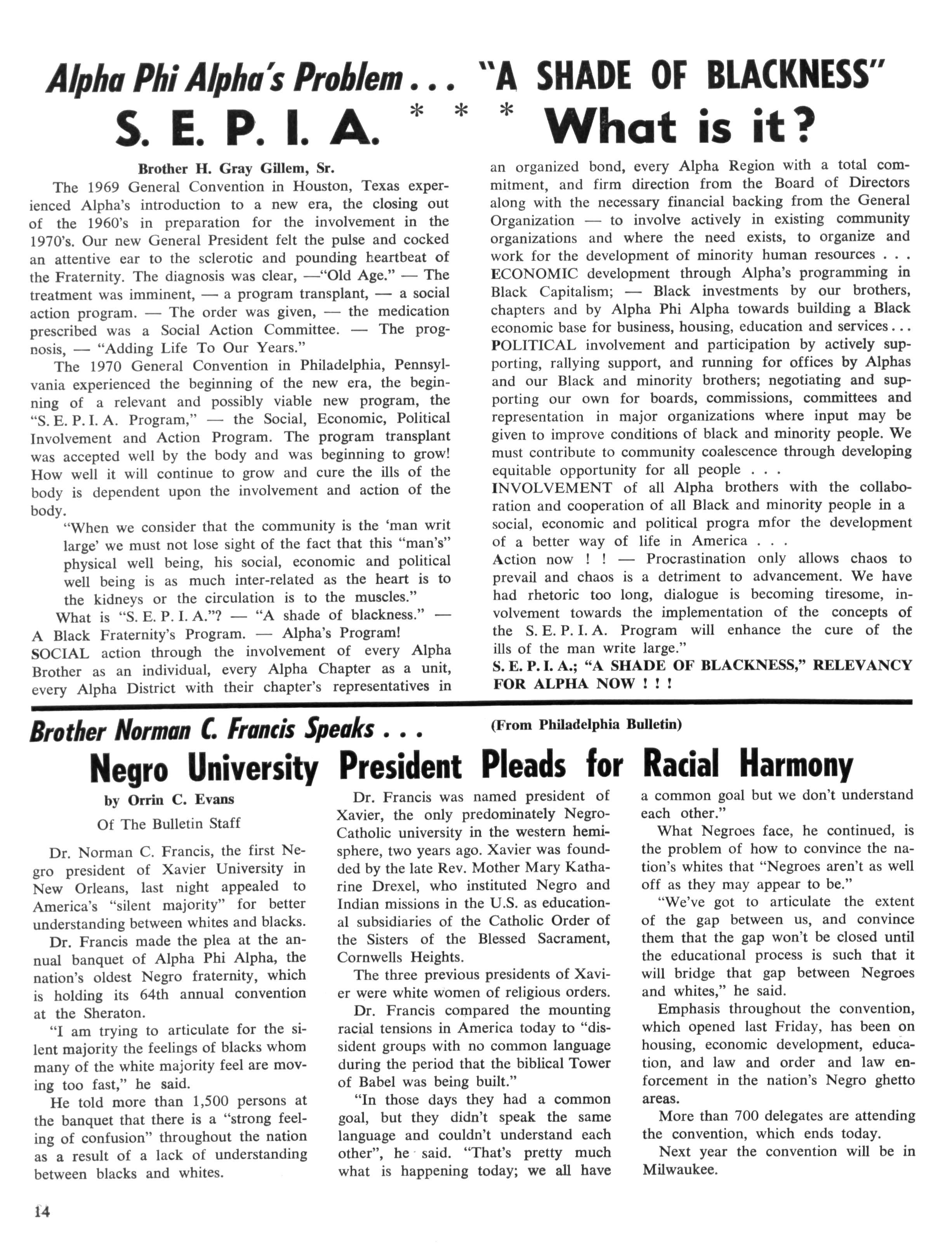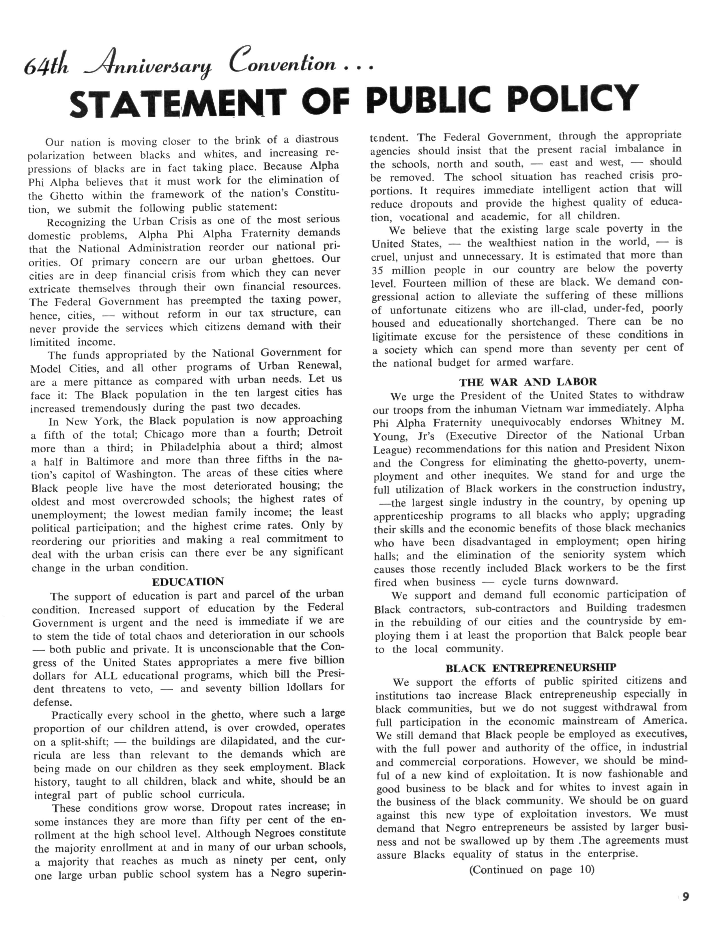 Aplha Phi Alpha through its history has been instrumental in moves to improve the status of Black Americans Many of us in Alpha Phi Alpha, as individuals and members of other organizations, are naturally concerned about the problems of disadvantaged people, but the question hasbeen asked repeatedly — is it our place as an organization to become involved in the problems of human improvement? To many men of Alpha, it seemed that was legitimately the concern of government and of social welfare agencies. I believe it is fair to say that this is the prevailing attitude towards this type of people problem held by many of us today. If times were normal, within limits, such might be an acceptable attitude But surely none of us need to be told that these are not normal times.