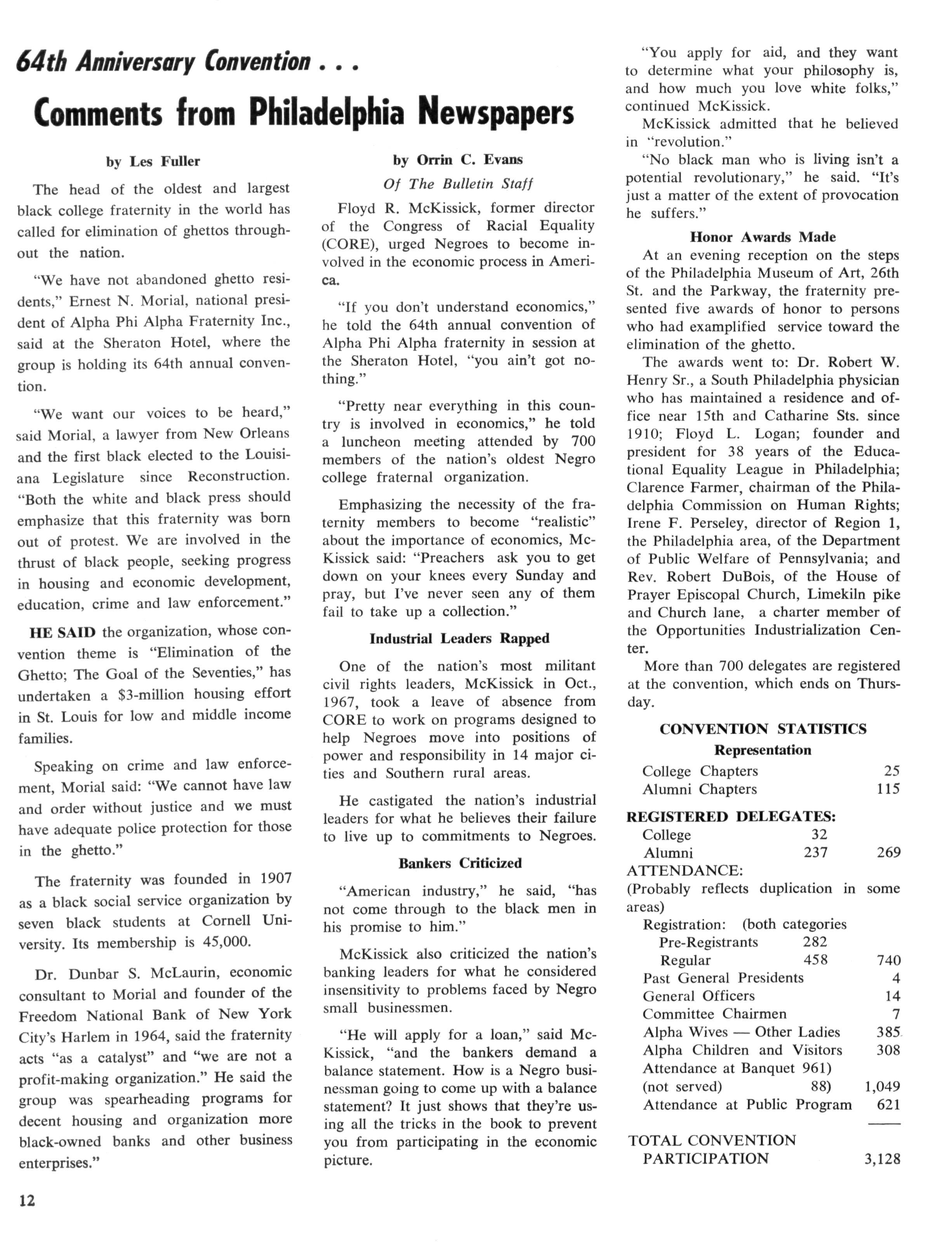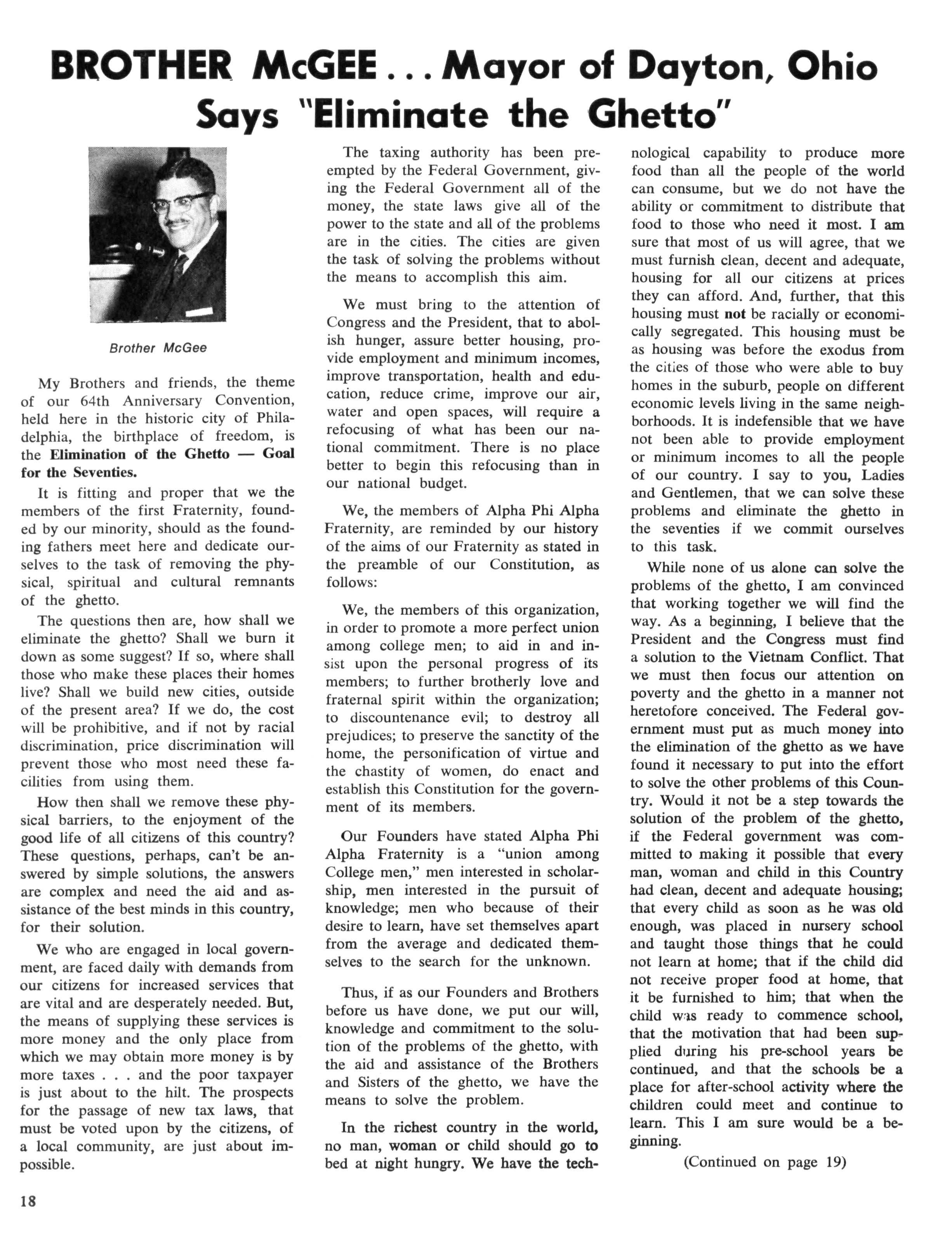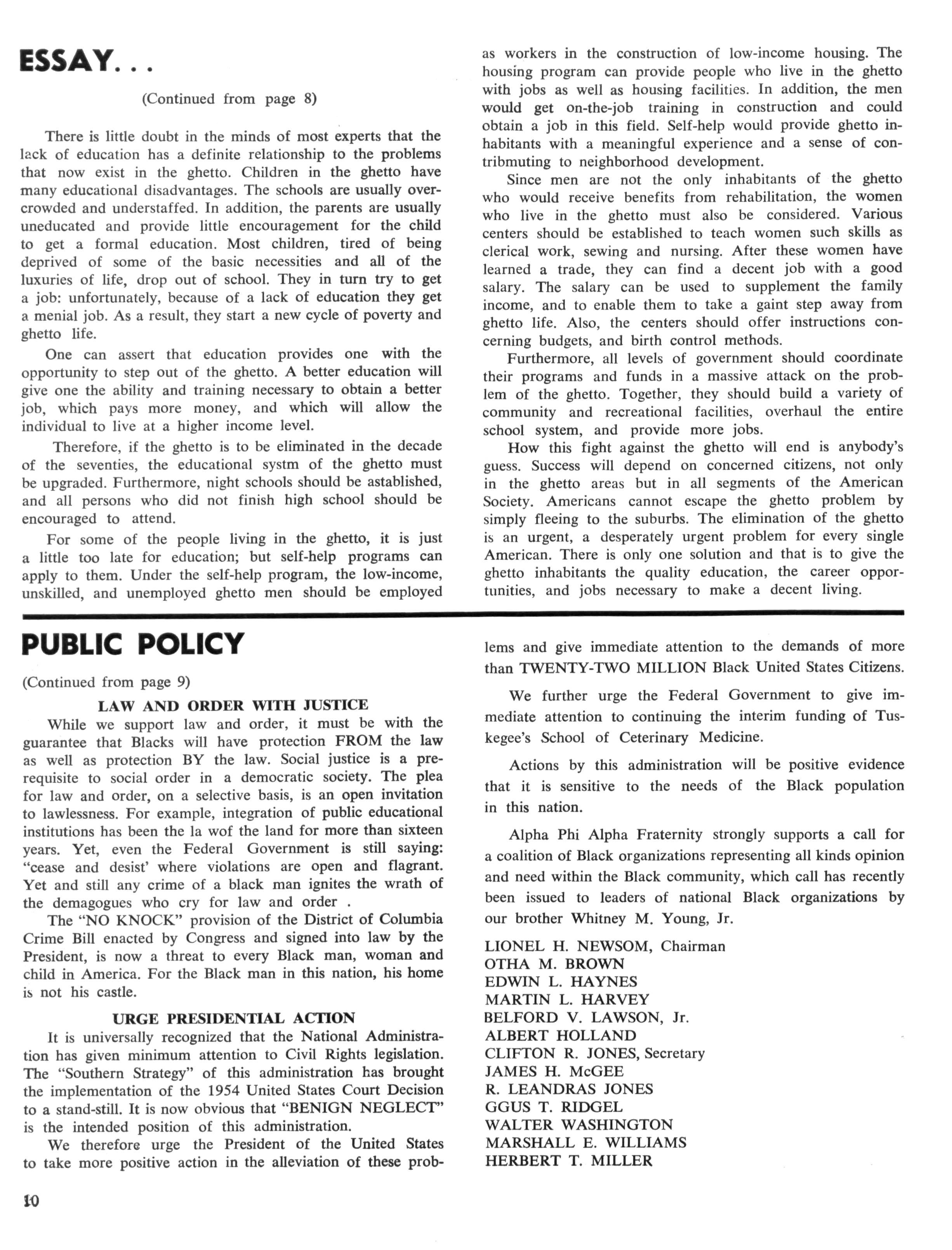 The size of the tasks we have before us, that of untroubling our urban areas, is enormous, and certainly requires the attention of Alpha Phi Alpha. The problems of the disadvantaged peoples in the cities of America are now horribly familiar to all of us — the problems of the ghetto, the slums, of ignorance and poverty, and racial discrimination The plight of these people were documented during the convention via seminars bearing directly on our theme: ELIMINATION of the GHETTO — GOAL for the SEVENTIES.