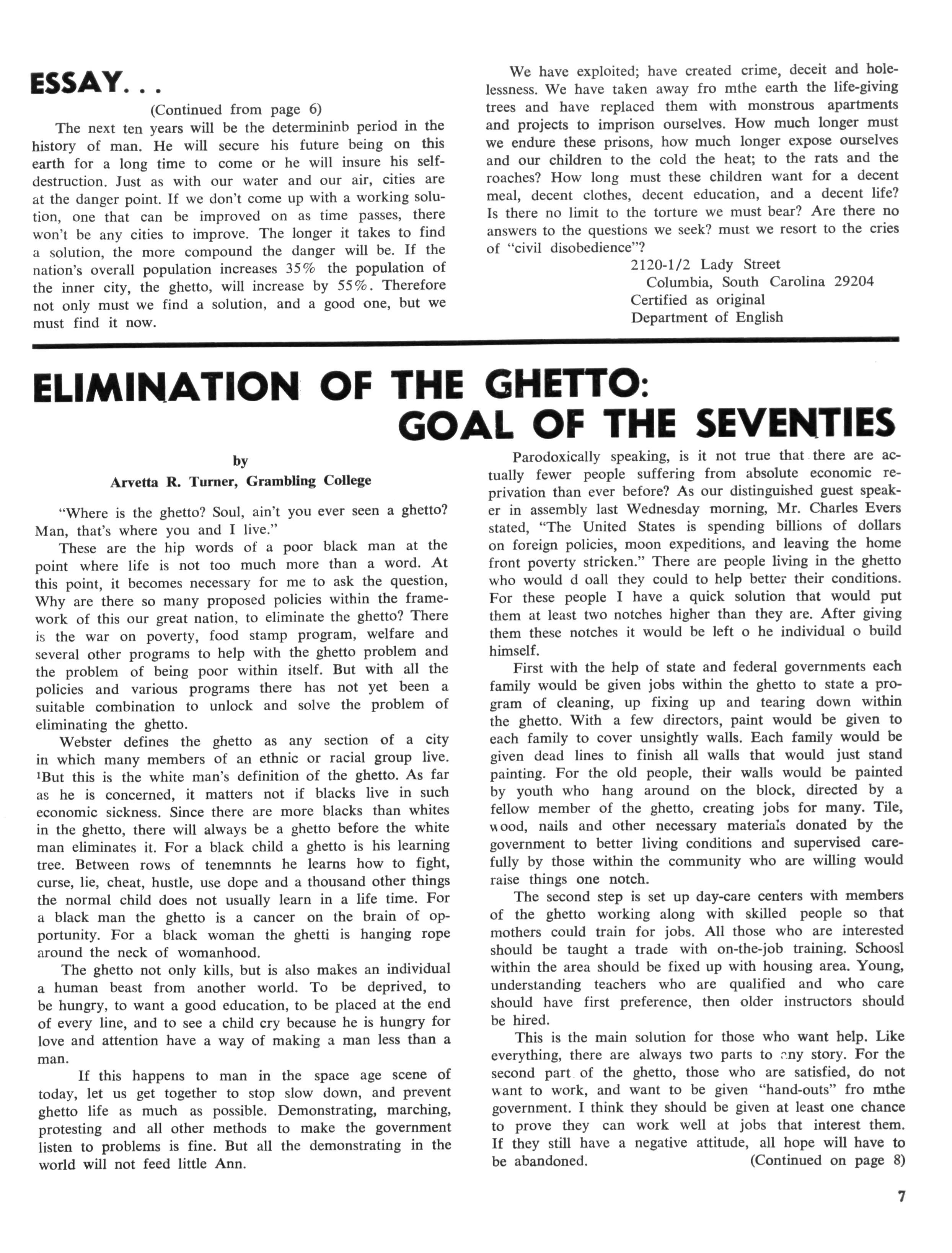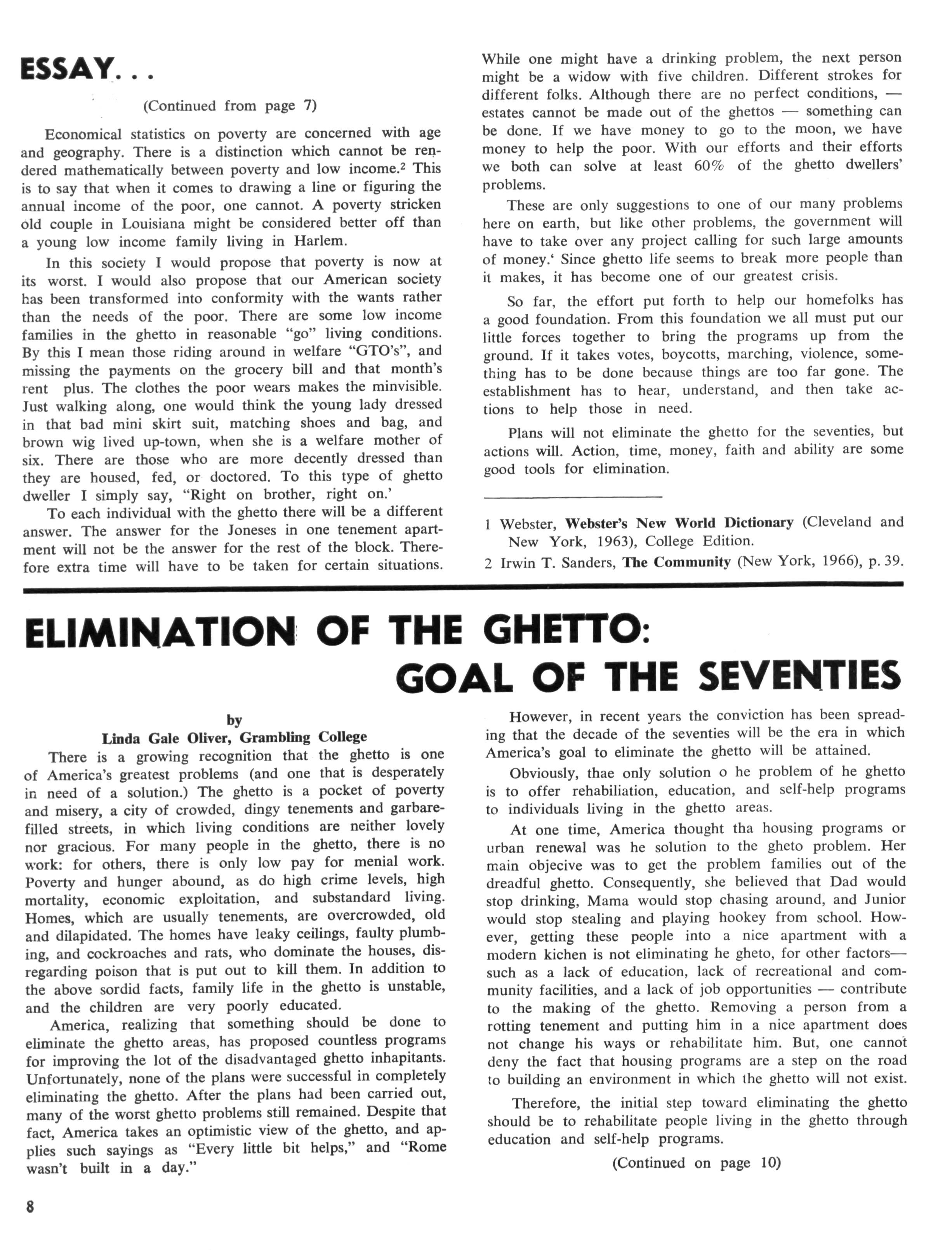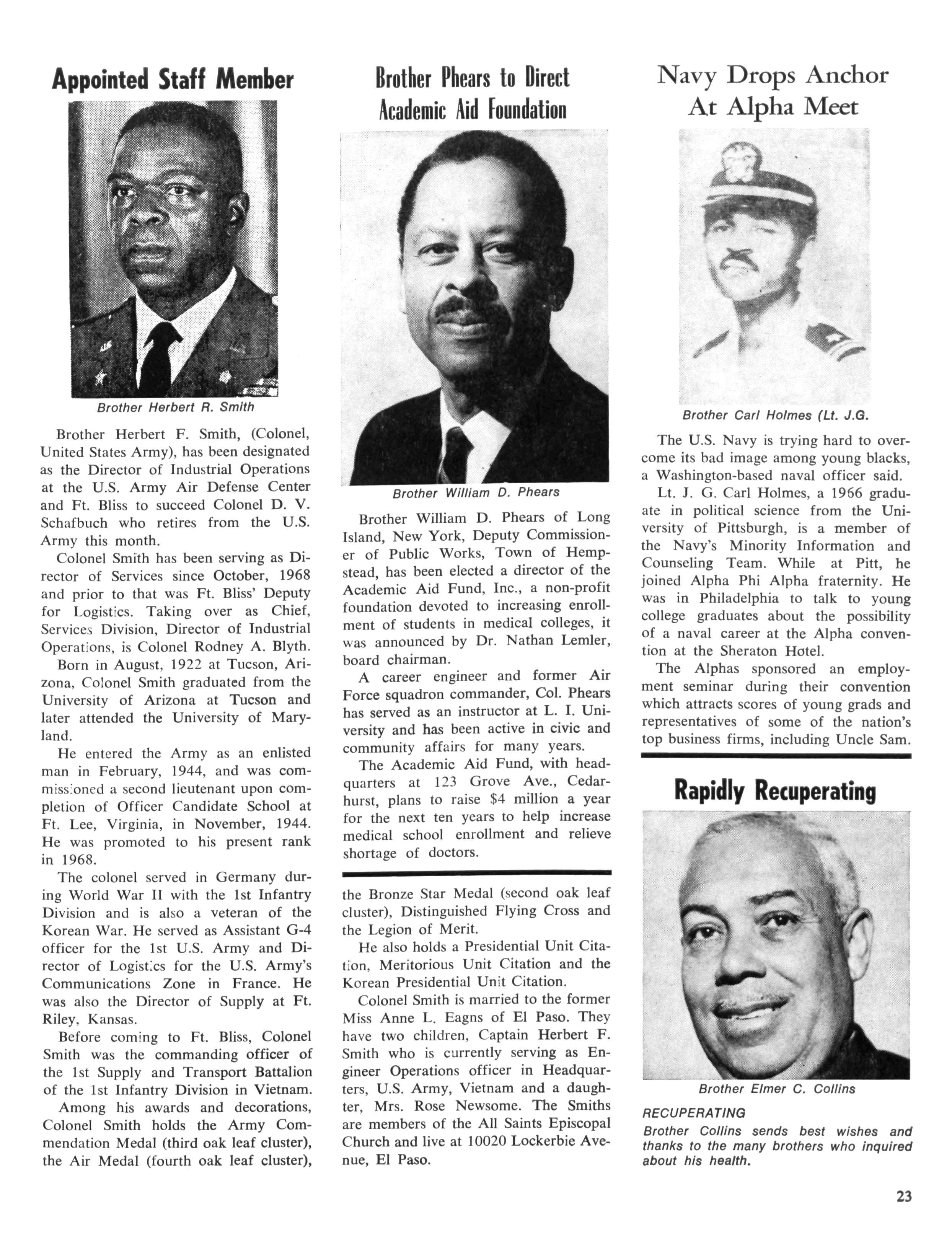 The size of the tasks we have before us, that of untroubling our urban areas, is enormous, and certainly requires the attention of Alpha Phi Alpha. The problems of the disadvantaged peoples in the cities of America are now horribly familiar to all of us — the problems of the ghetto, the slums, of ignorance and poverty, and racial discrimination The plight of these people were documented during the convention via seminars bearing directly on our theme: ELIMINATION of the GHETTO — GOAL for the SEVENTIES.
