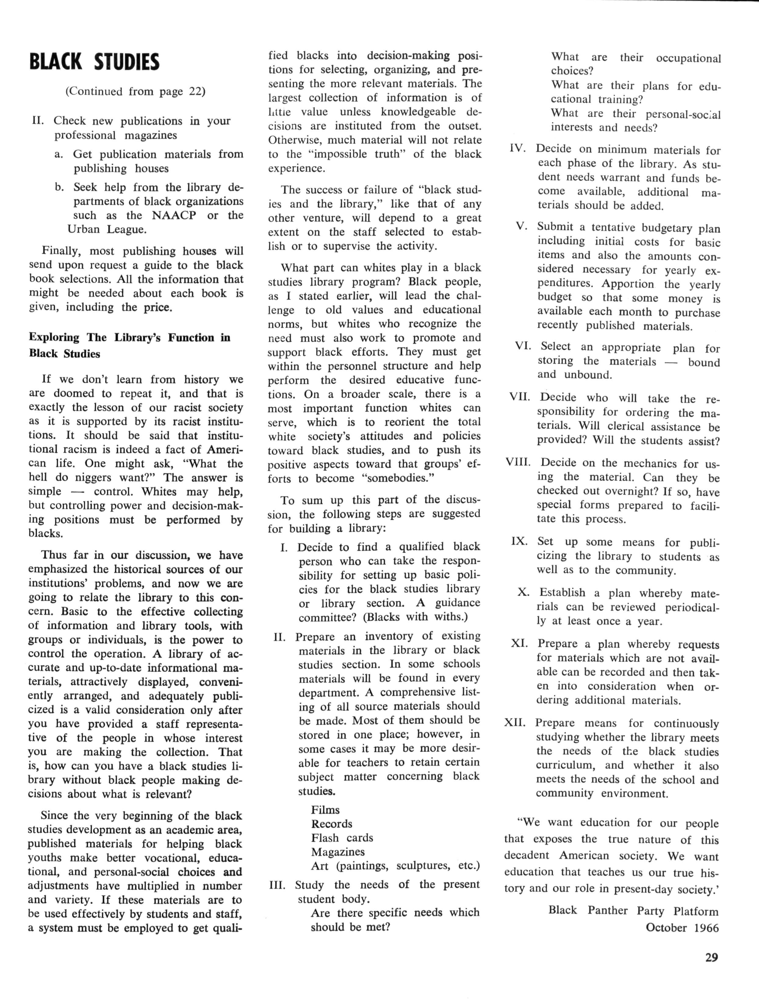 From early times the different cultures of man have had an instinctive desire to record their thoughts and deeds Black studies, with library support, will be able to bring together the memories of the black race: scientists, historians, poets, philosophers, and others who have interest in the field of black studies will be our pillars of pride. Through the field of black studies the library will be able to take the young student into a world of black charm and dignity — a new adventure in learning.