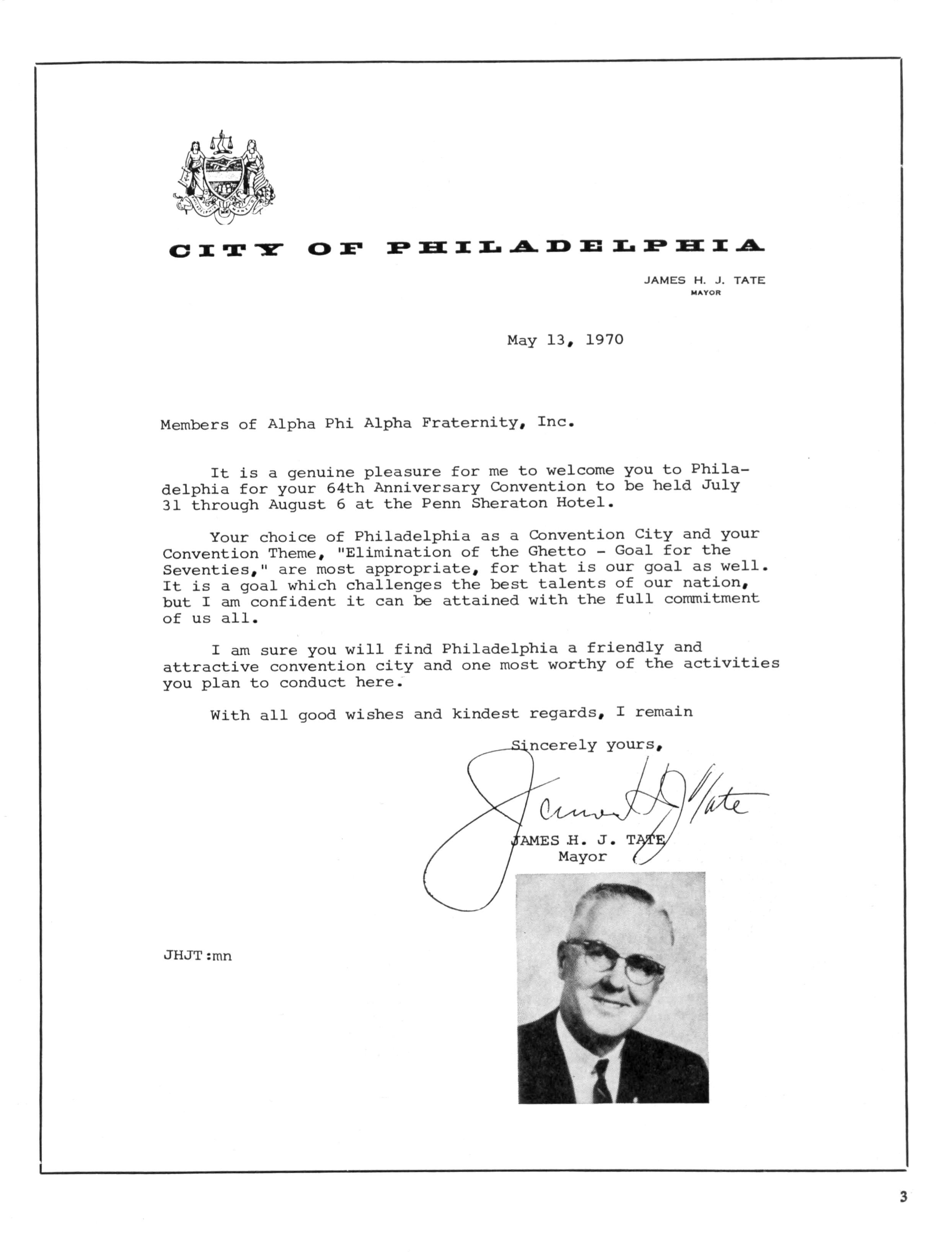 It is a pleasure to extend greetings and warmest wishes to everyone attending the 64th Annual Convention of Alpha Phi Alpha Fraternity, Inc., being held in Philadelphia from July 31» 1970 until August 6, 1970.