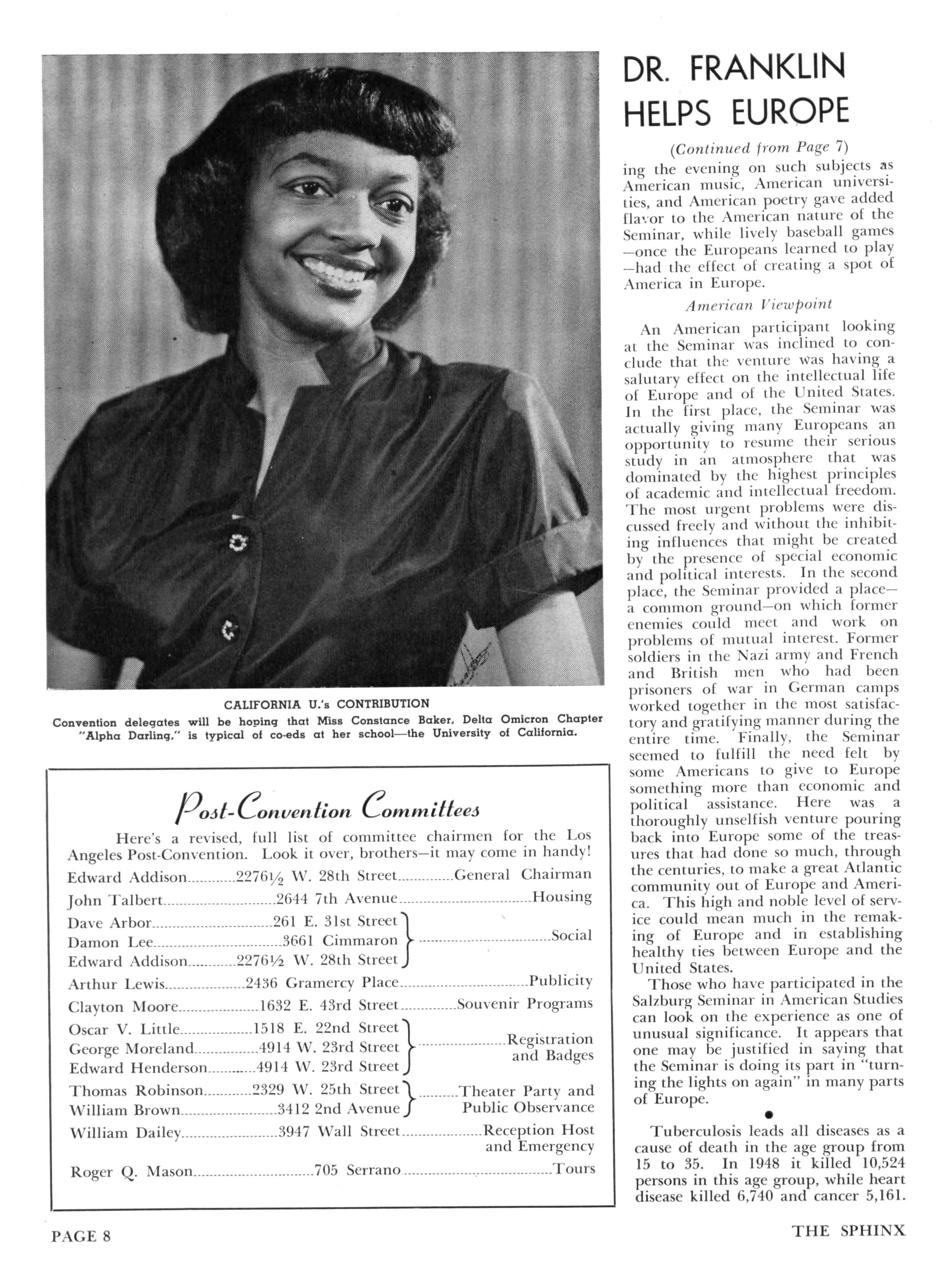 Dr John Hope Franklin, also of the History Department at Howard University, was a visiting professor at Harvard University during the summer of 1950 and during the summer of 1951 was on the faculty of the Salzburg Seminar in American Studies at the University of Salzburg, Austria. This seminar is a project administered by Harvard University for adult advanced graduate students in European countries. The faculty includes distinguished professors from American colleges and universities. Brother Franklin also has been visiting Italy and lecturing at various other European universities
