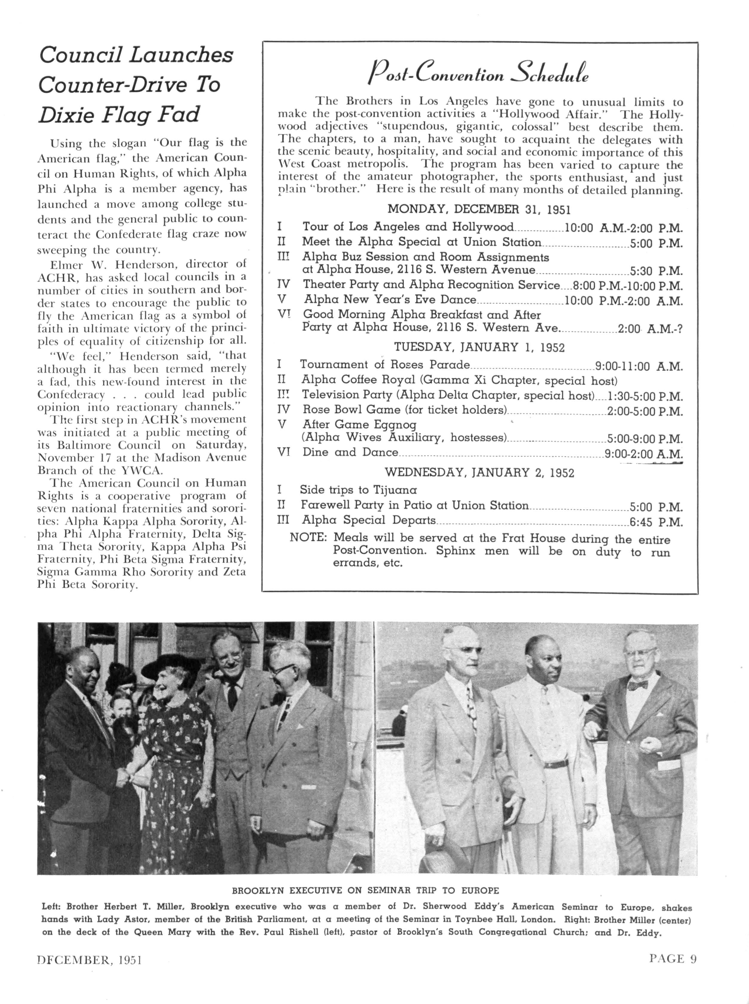 Included among these "features" was a joint meeting with Delta Iota Lambda Chapter of Columbus, Georgia, with a discussion on Civilian Defense led by Brother R. M. Haskins, president of Delta Iota Lambda Chapter In another feature Brother Robert D. Reid, professor of History and chairman of the Division of General Studies at Tuskegee Institute, discussed current world affairs In a third, Brother F D Patterson, who recently returned from a tour of Europe and Africa, gave a resume and travelog of his trip, with movies made on the tour. Wives and visiting brothers to the annual Medical Clinic were invited to this session
