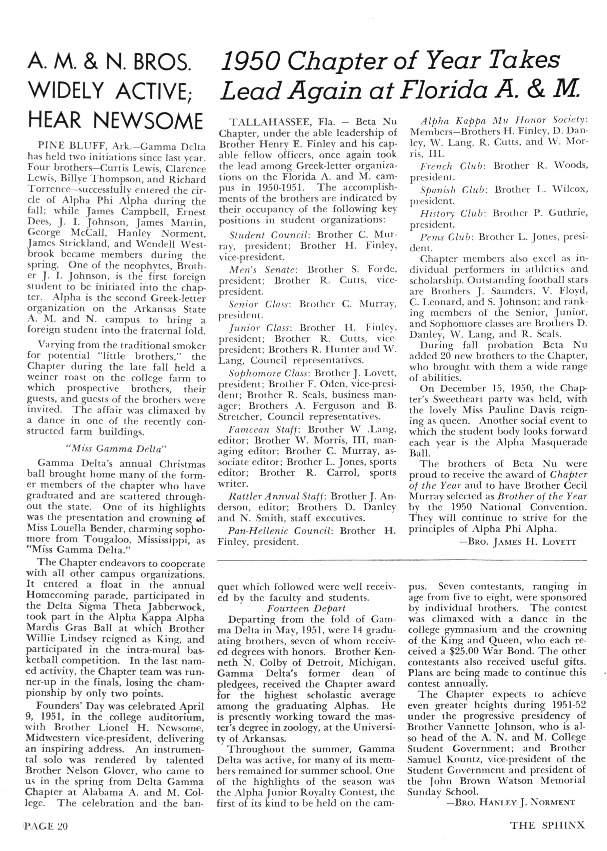 In keeping with Alpha's high regard for leadership and scholarship, the brothers of Gamma Phi hold the following key positions in campus student organizations: Harry T. Waters, president of the Senior Class; Leon A Wilson, editor-in-chief, Tuskeana (Senior Annual); Sherman Todd, president, Industrial Arts Club; and Nicholas Newman, president, Veterinary Medical Society The following brothers have been nominated and have qualified as candidates for the forthcoming issue of "Who's Who in American Colleges"; Harry T Waters, Dwight Burges, Edward T. Braye, Elmore Giles, Nicholas Newman, and Sherman Todd