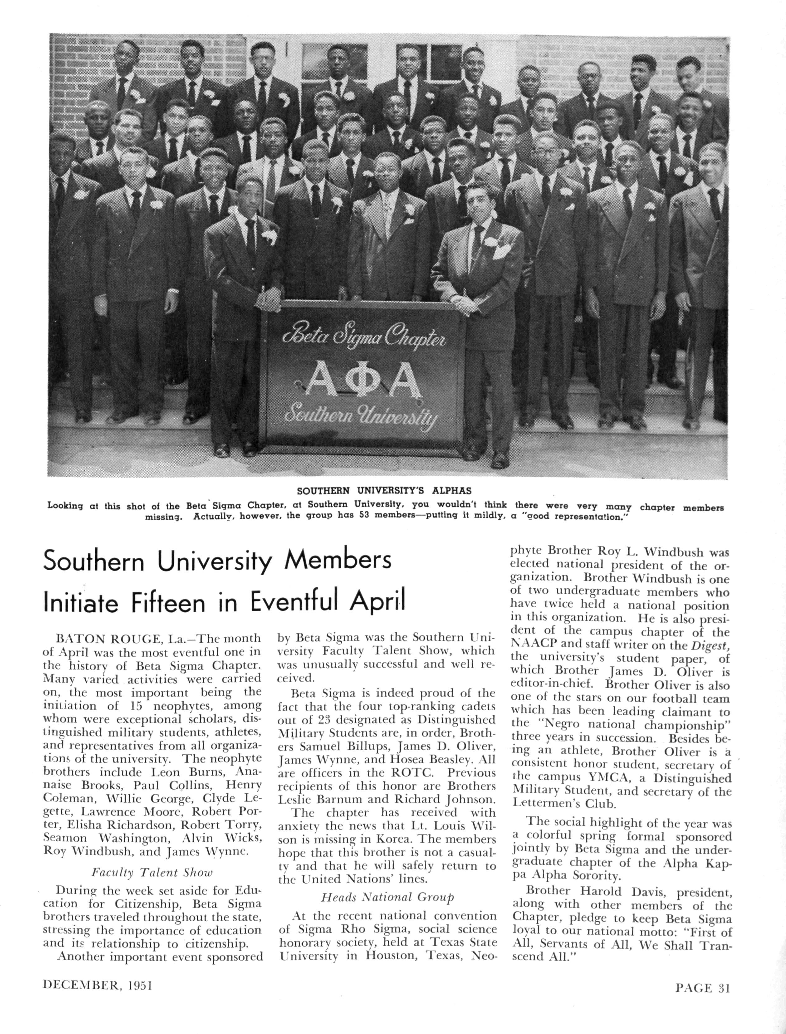 In the latter category are the accomplishments of Brother Albert Floyd, one of the two Negro aviators in the United States Navy Born in Cordova, Alabama, Brother Floyd attended Morehouse College for two years and on December 16, 1948, crossed the burning sands Later he was inducted in the Armed Forces, and after receiving hiswings on March 21, 1951,Ensign Floyd returned to Alpha Rho for two days and attended a smoker given in his honor at the home of Brother T M Alexander