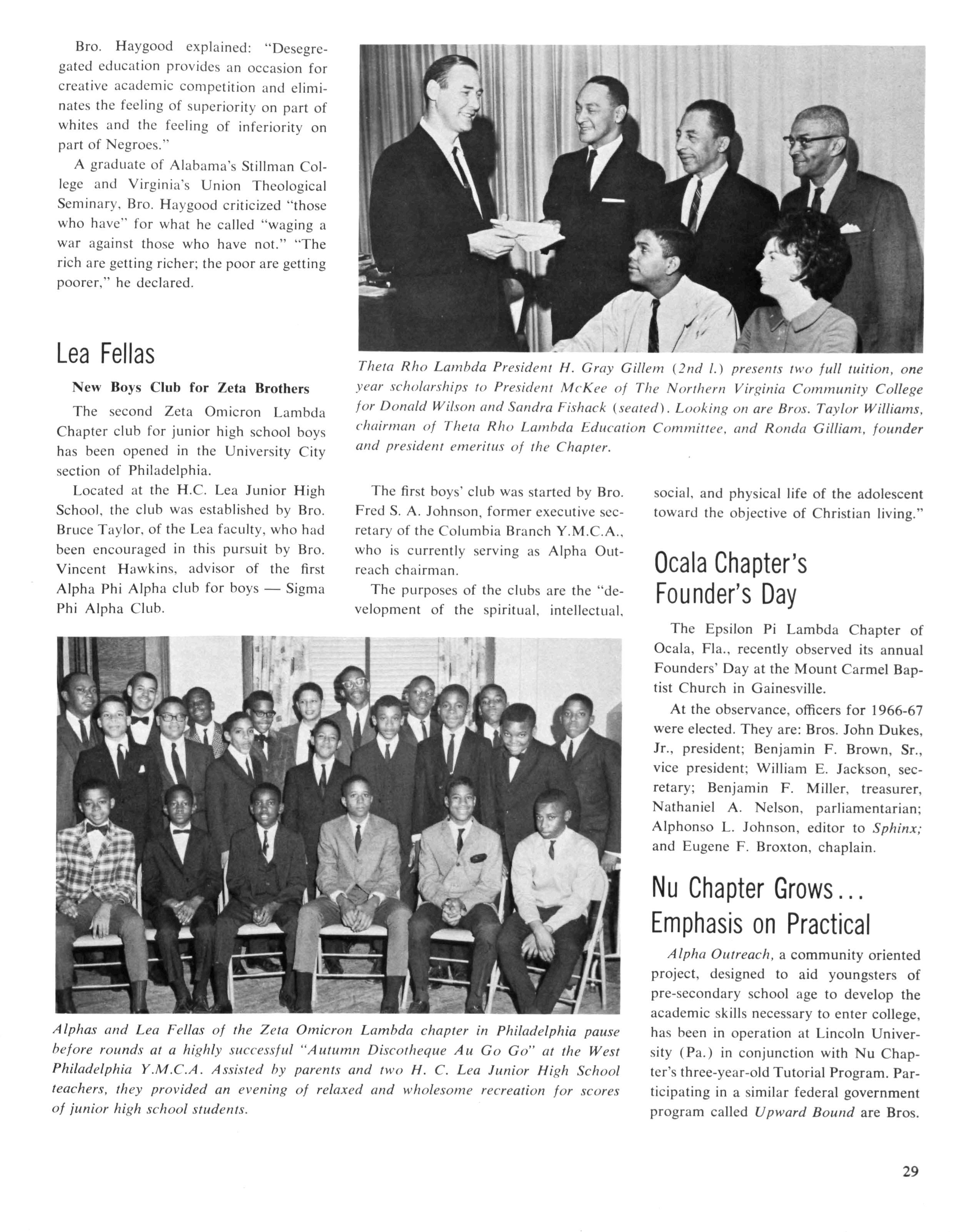 Alpha Outreach, a community oriented project, designed to aid youngsters of pre-secondary school age to develop the academic skills necessary to enter college, has been in operation at Lincoln University (Pa.) in conjunction with Nu Chapter's three-year-old Tutorial Program Participating in a similar federal government program called Upward Bound are Bros