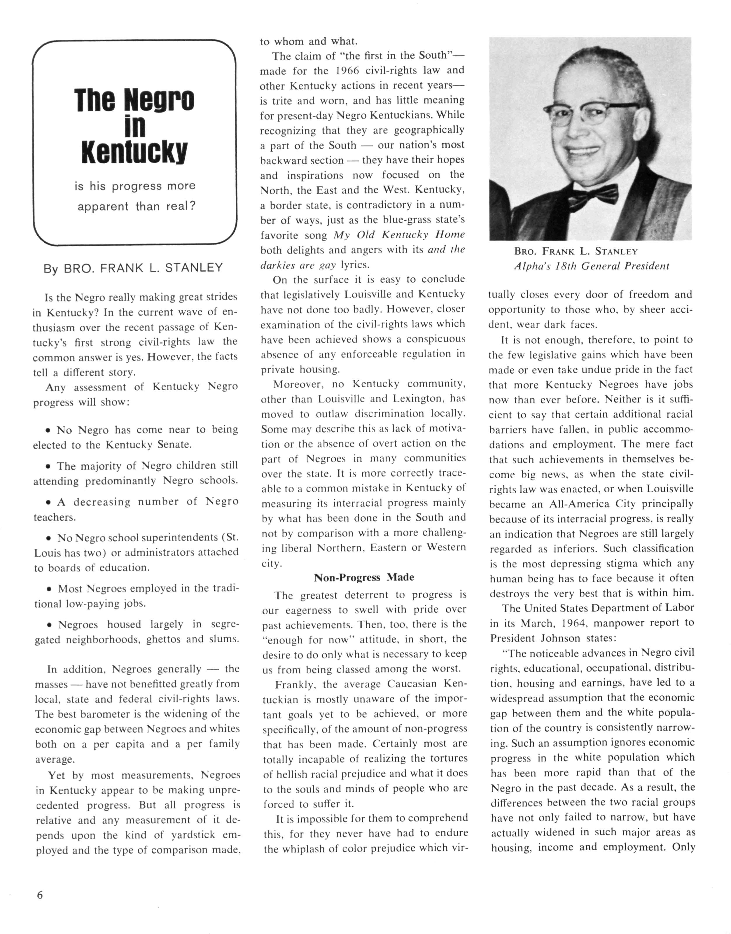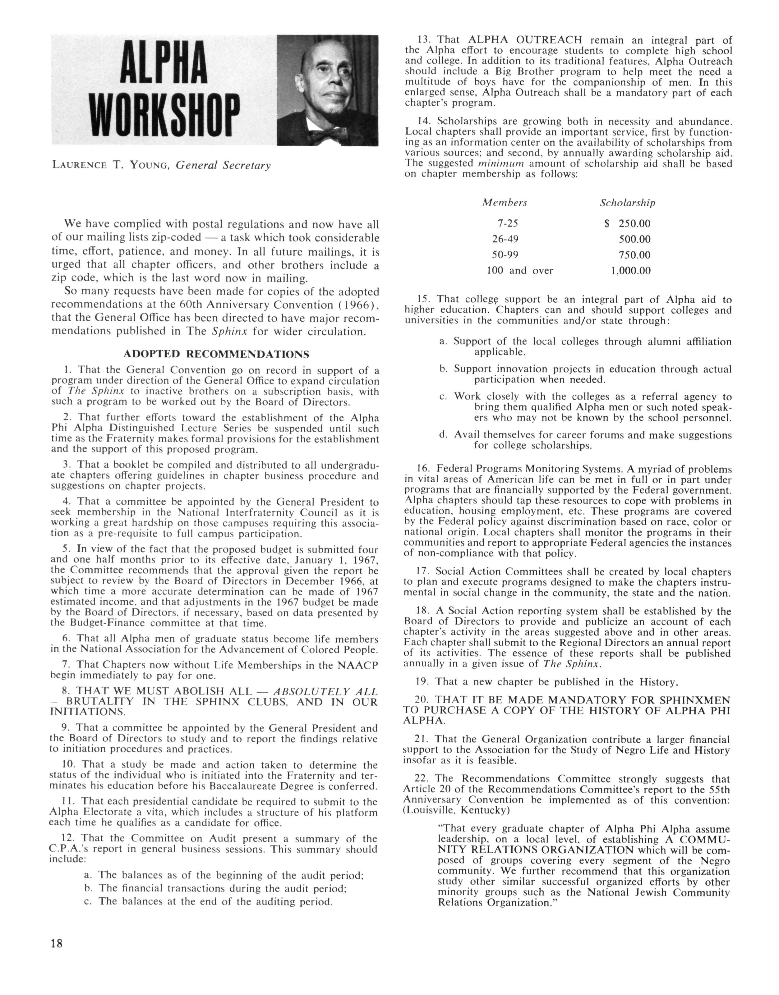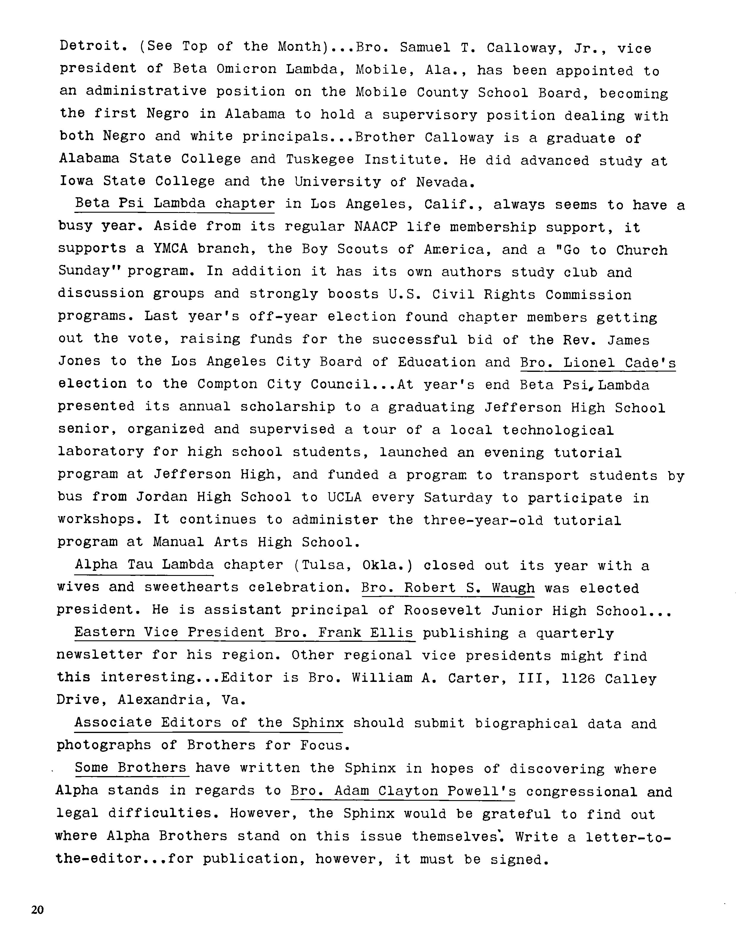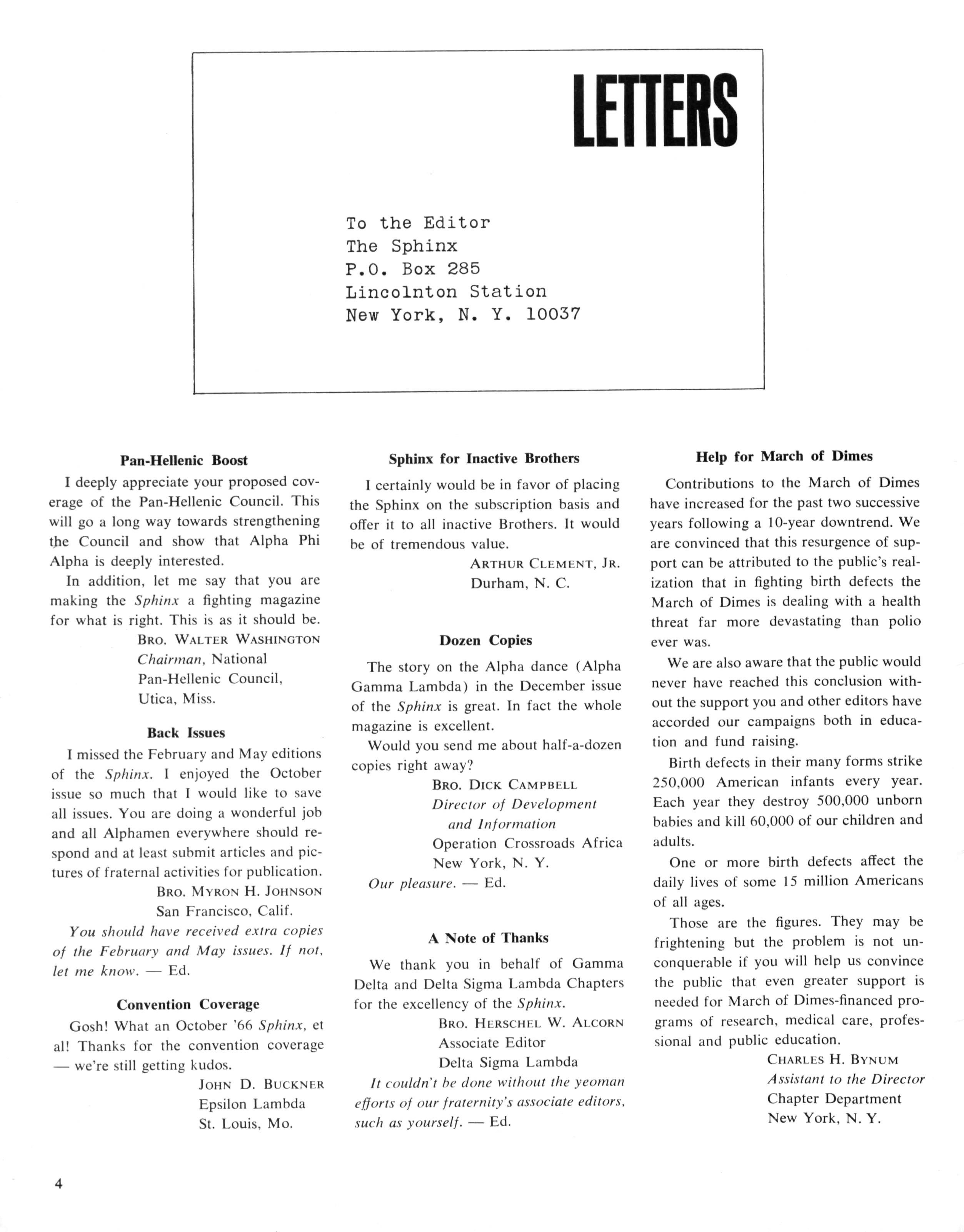 Opinions expressed in columns and articles do not necessarily reflect the views and policies of Alpha Phi Alpha Fraternity, Inc., and use of any person's name in fiction, semi-fiction articles or humorous features is to be regarded as a coincidence and not as the responsibility of The Sphinx It is never done knowingly Copyright 1965 by The Sphinx, Alpha Phi Alpha Fraternity, Inc Reproduction or use, without written permission, of the editorial or pictorial content in any manner is prohibited