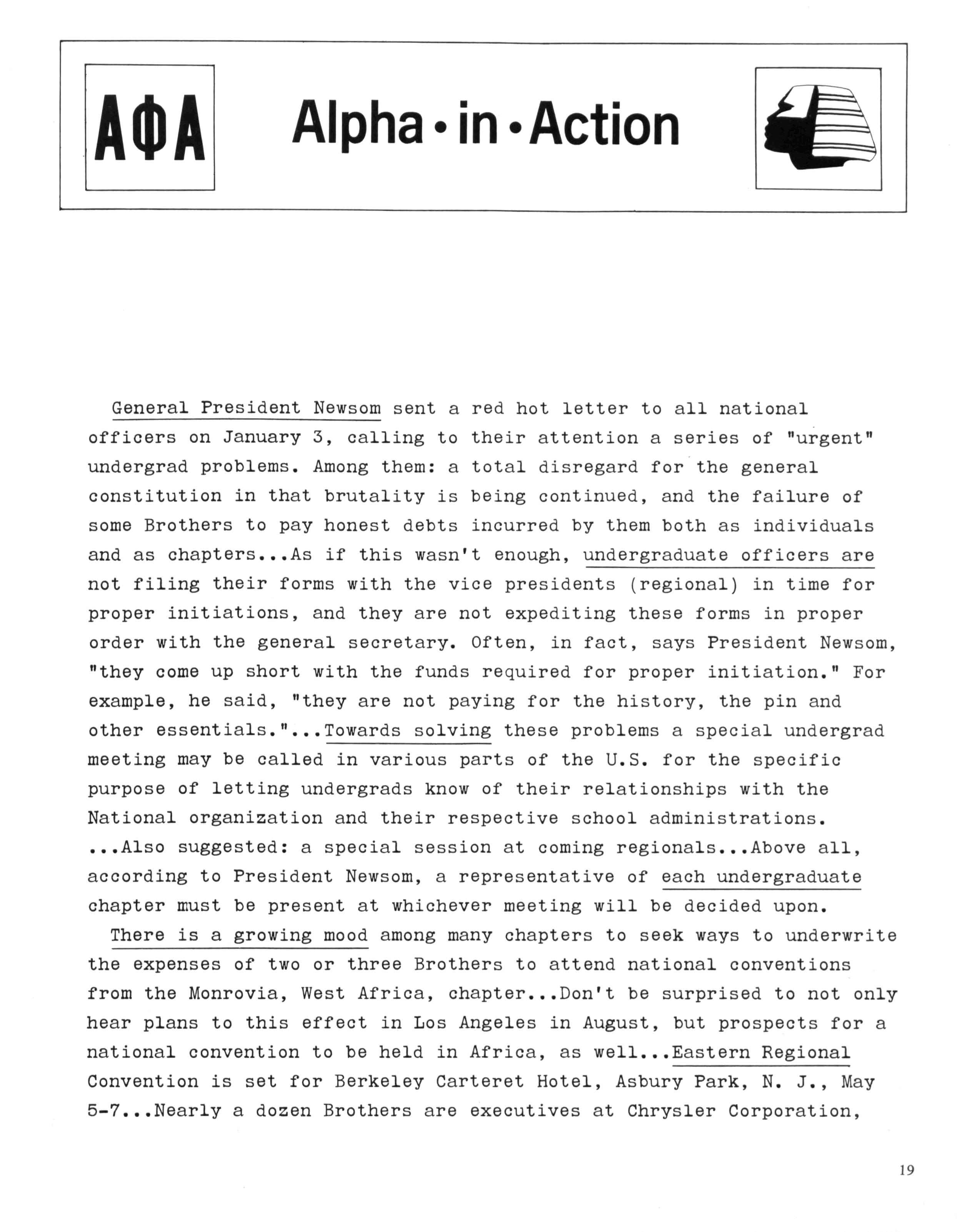 Plans are being projected for a Negro Culture Week early this semester Already contacts are being made with the national headquarters to secure one or more Brothers who are leaders in the Civil Rights movement, as Dick Gregory, Floyd McKissick, and Martin Luther King, Jr. The program will focus on Black Power, the direction of the Civil