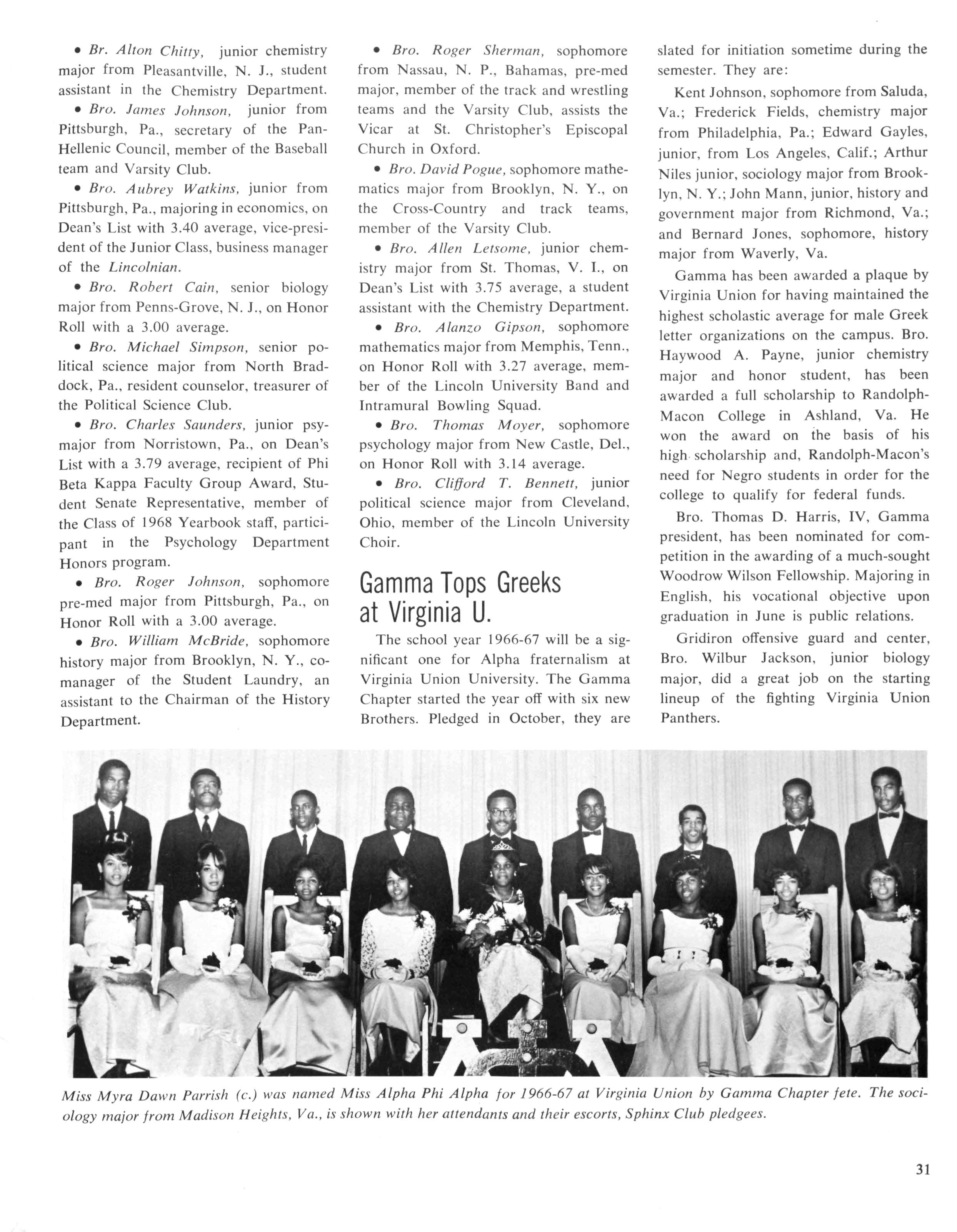 The school year 1966-67 will be a significant one for Alpha fraternalism at Virginia Union University The Gamma Chapter started the year off with six new Brothers Pledged in October, they are