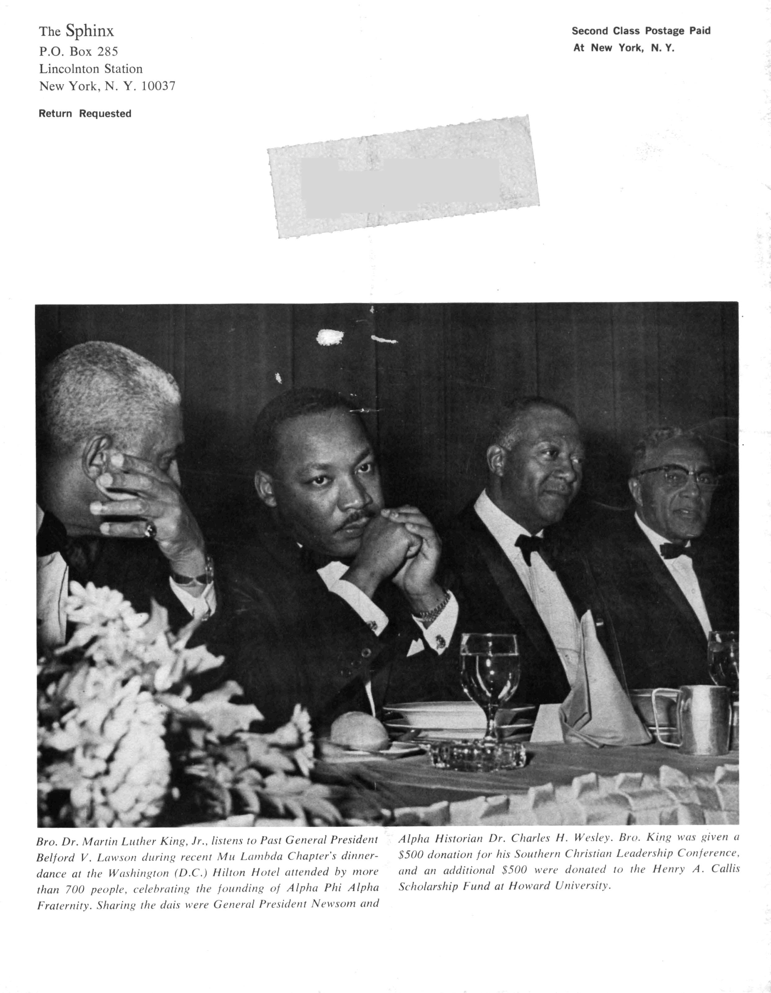Alpha Historian Dr. Charles H. Wesley. Bro. King was given a $500 donation for his Southern Christian Leadership Conference, and an additional $500 were donated to the Henry A. Callis Scholarship Fund at Howard University.