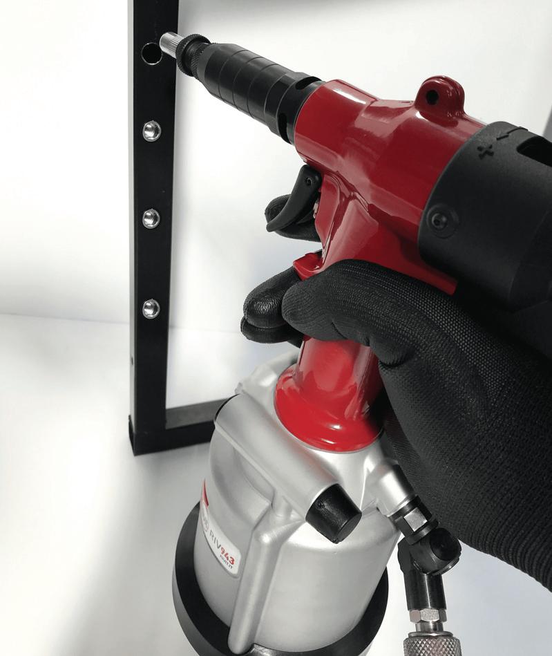 The new RIV943 is Rivit's topoftherange hydropneumatic riveting tool for threaded rivet nuts. Its powerful motor offers superior performance, usually associated with booster machines, while maintaining excellent manoeuvrability. It is ideal for applications in the automotive, railway,