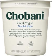 Try CHOBANI Nonfat Plain Greek Yogurt strained to be thick and creamy. Made the old-world way, locally sourced and authentically crafted, batch by single batch. Perfect for smallspoon eating or big-spoon cooking!